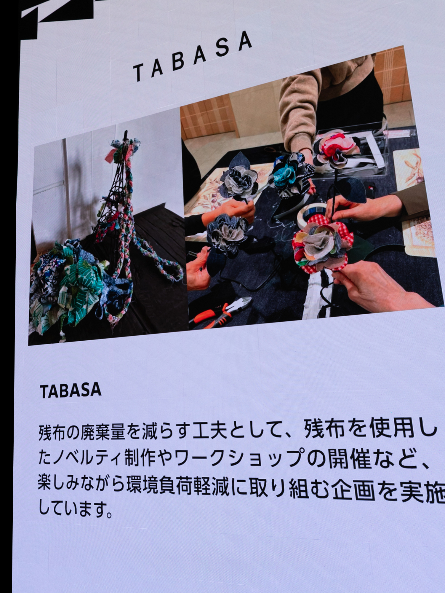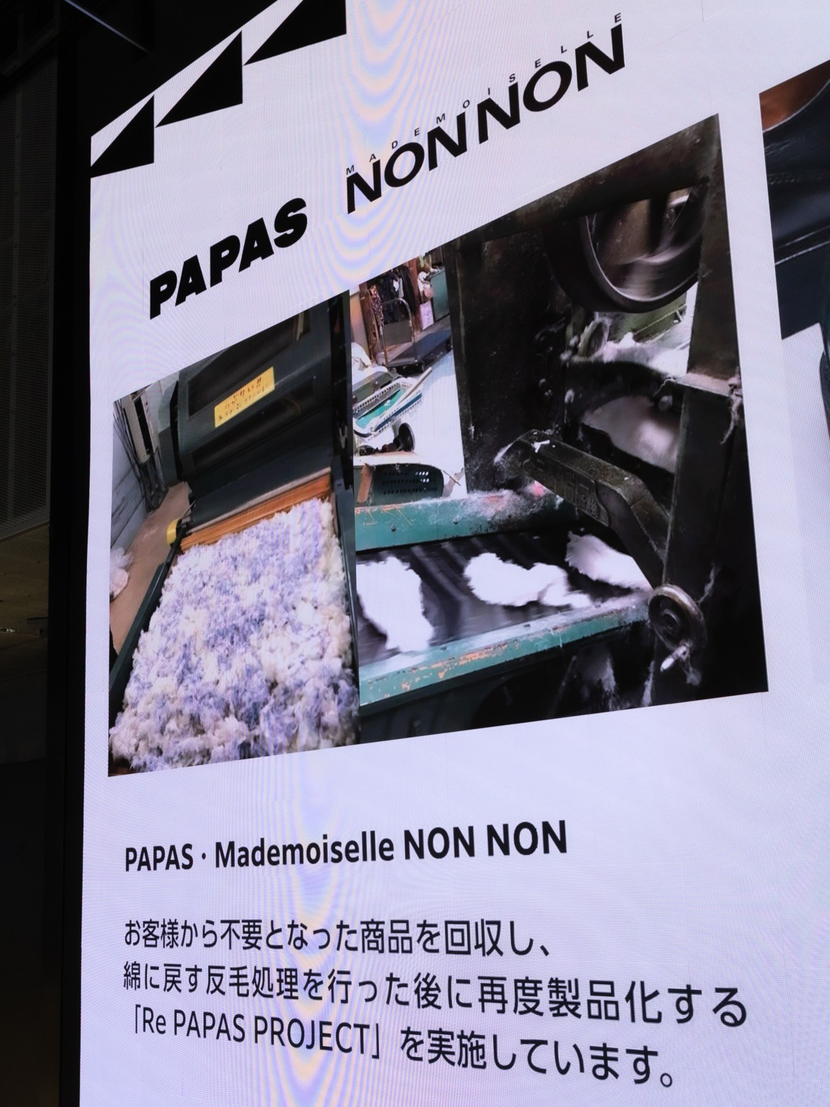 PAPAS・Mademoiselle NON NON・TABASAのサステナブルな取り組みをイベント会場内の巨大モニターで紹介。