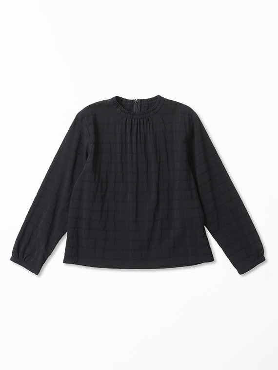 薄地ながら落ち感のあるドレープ性とシルキータッチな光沢感、適度なハリ感が融合されたサッカー素材のブラウス。衿元にギャザーを施したプチハイネックがポイントです。顔まわりを華やかに演出してくれるため、アクセサリーなしでも品のあるスタイリングが完成します。