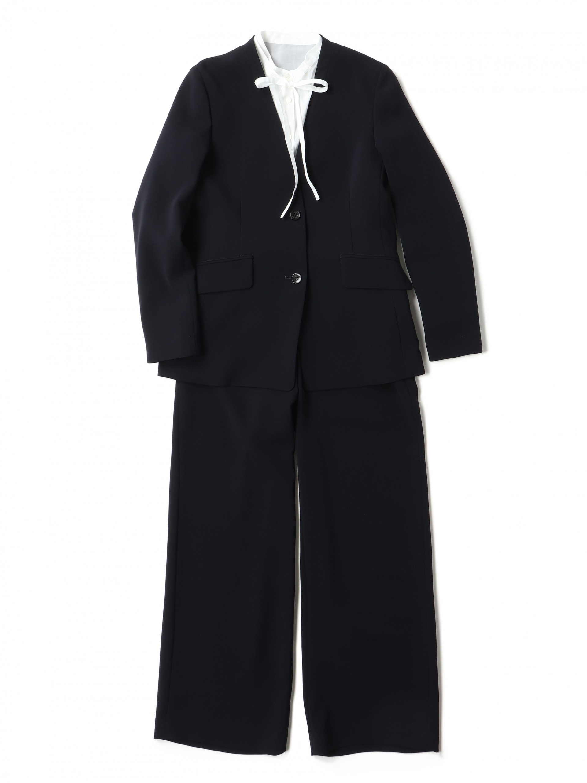 ダブルクロスストレッチ素材を使用したジャケットとワイドパンツのセットアップスタイル。ジャケットは羽織るだけで着映えし、シャープなVネックにより細見え効果も期待できます。これまでにない素材感ながら、ベーシックなデザインがコーディネートしやすく、単品使いも◎。インナーはリボン付きのブラウスを合わせ、程よい華やかさを演出しました。