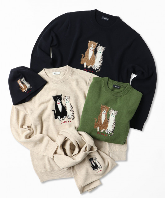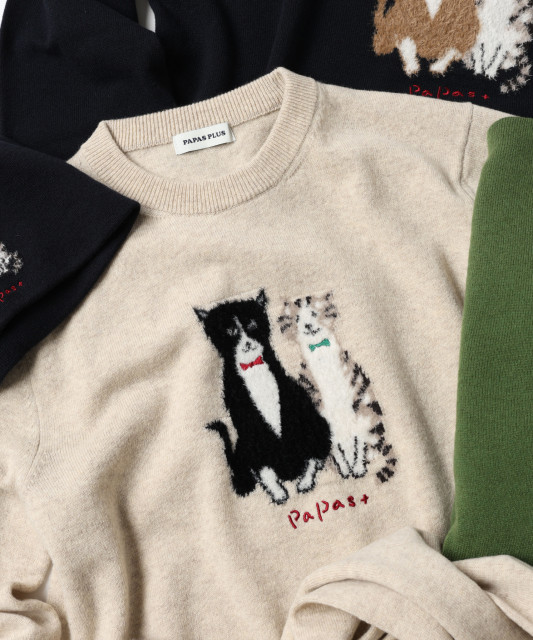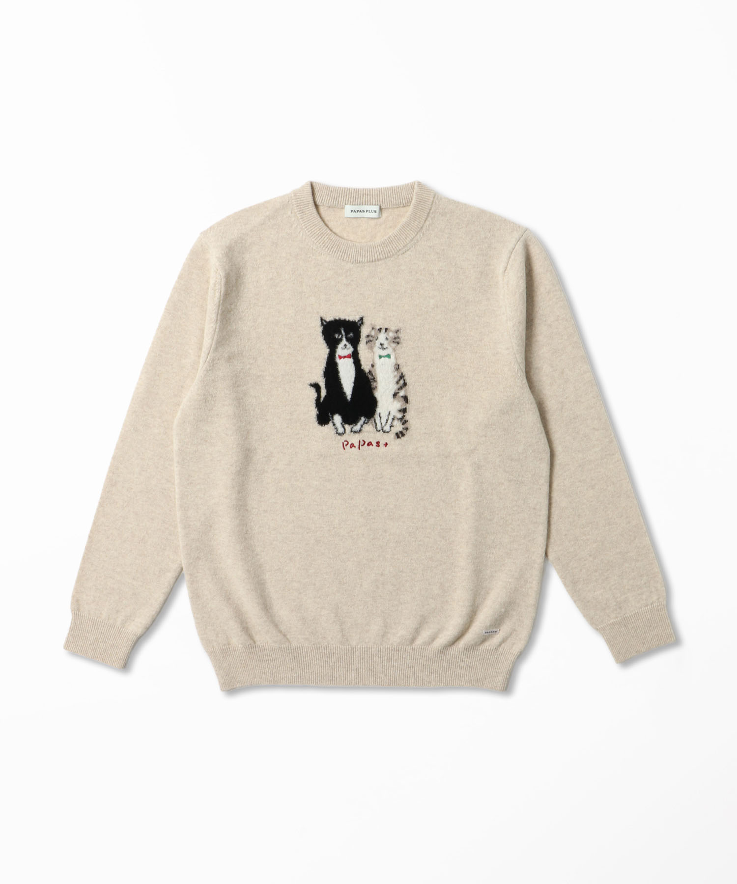 ウールニットインターシャ7G ネコ柄 クルーネックセーター(¥49,500 税込)