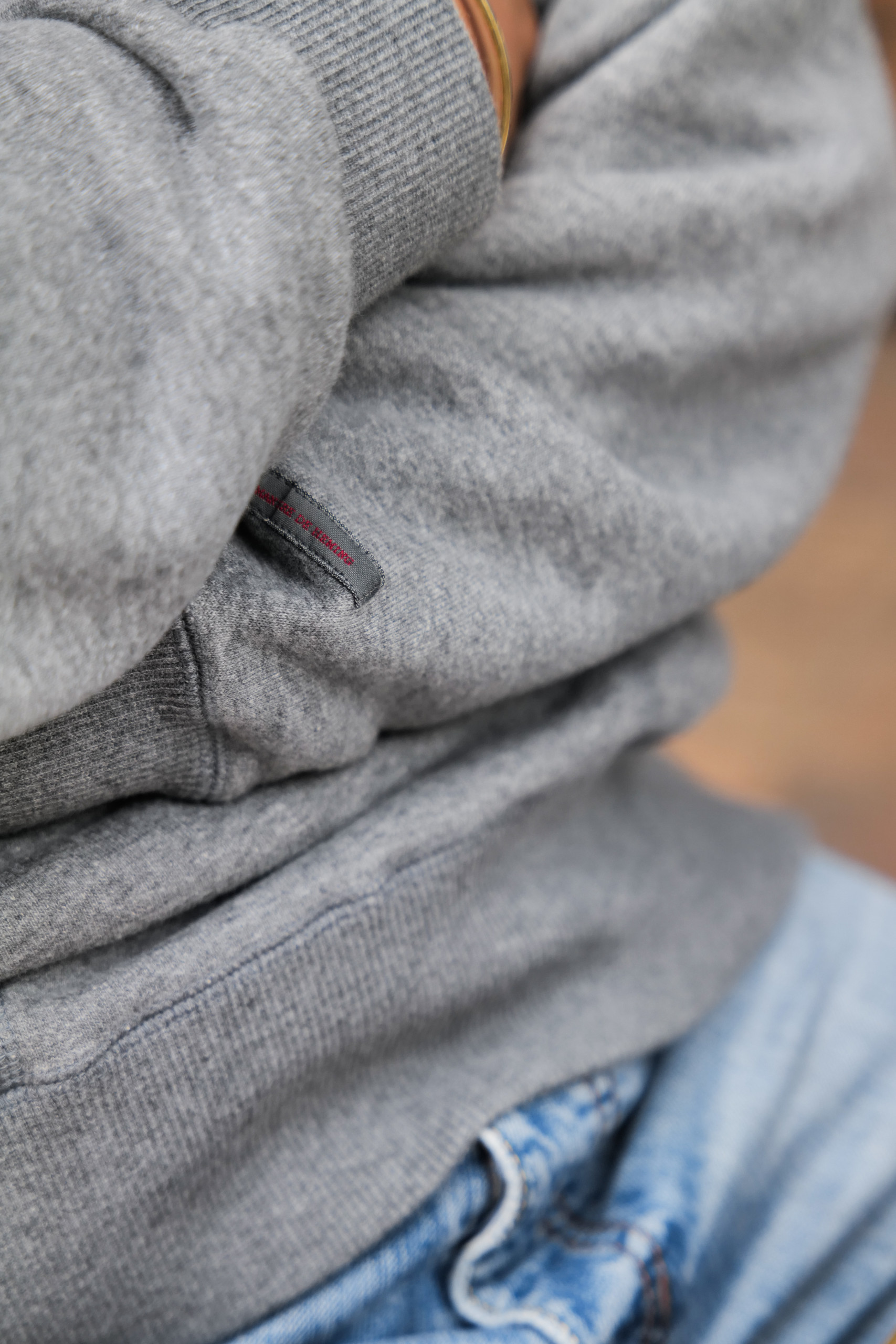 パーカのようにフロントポケットが付くもののフードはなく、ハイネックにアレンジされている、粋なデザインの新作スウェット。ネック裏のアクセントも効いています! 定番よりも少しゆとりをもたせたシルエットも今の気分。カラーは中曽根さんが着用したグレーの他に、オリーブグリーンとブラックを用意しています。