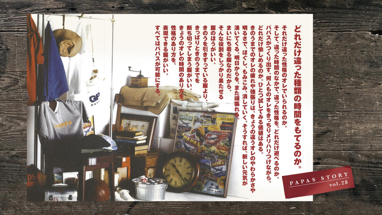 パパスには洋服だけではない魅力がある。「PAPAS BOOK」に代表される言葉で表現するカルチャー。服作りに対する確固たる思いを活字にすることでパパスの世界を物語ってきた。その一部を紹介する新しいコンテンツ「PAPAS STORY」。過去から現在までその変わらぬスタイルをご覧ください。