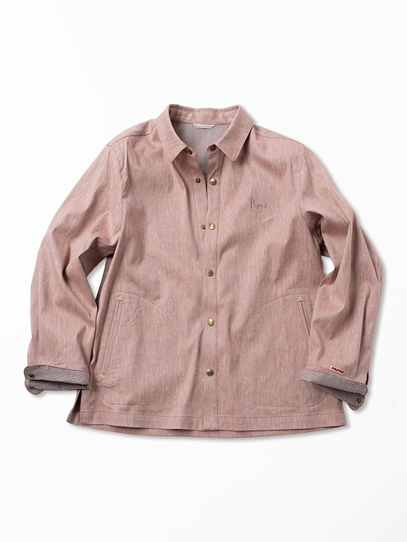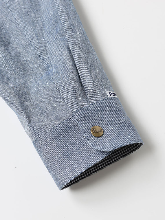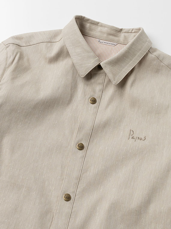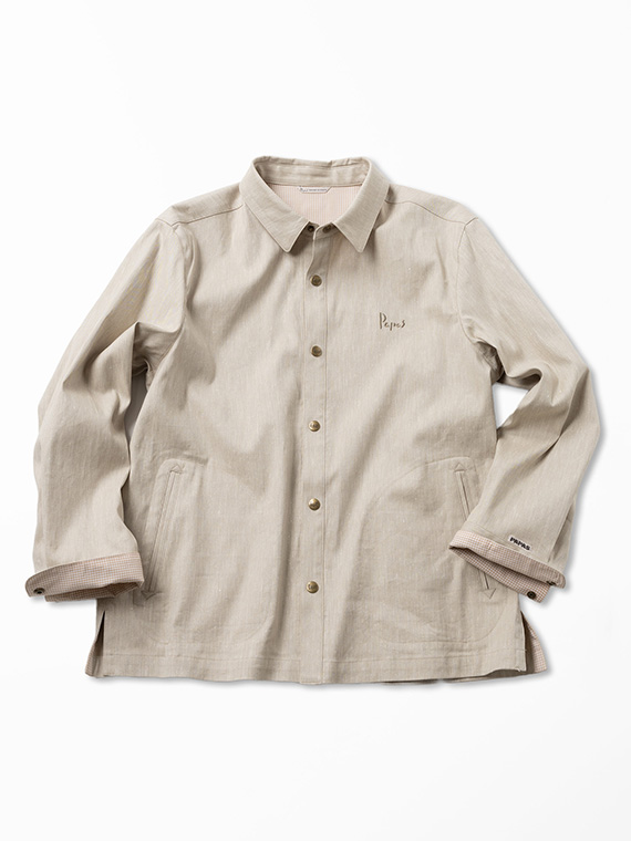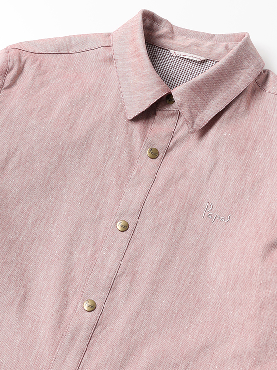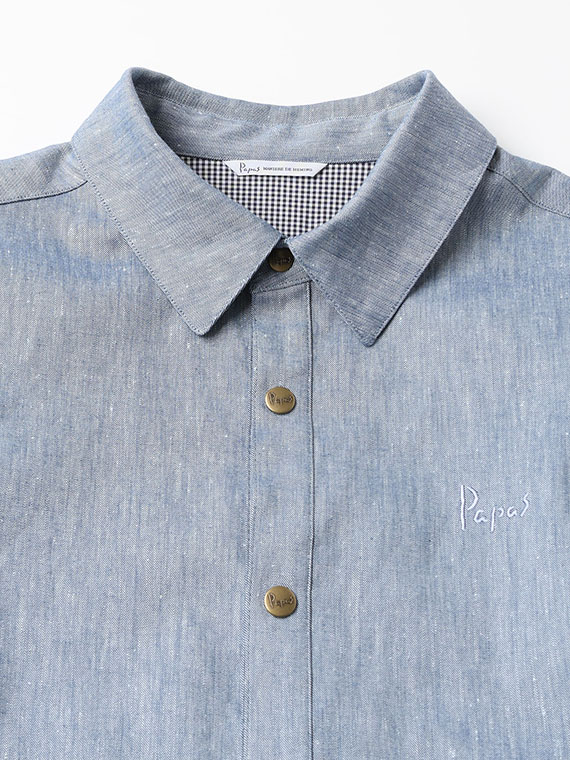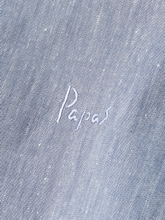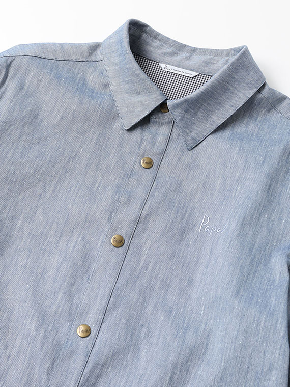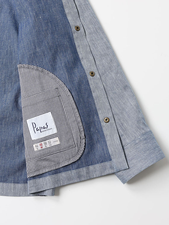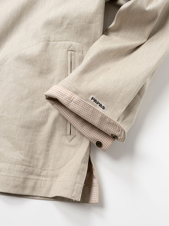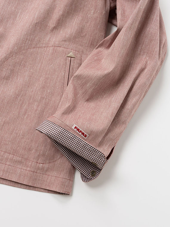 左胸にはPapas刺繍をさりげなくあしらい、ヨーク裏・カフス裏・腰ポケット袋布・スリット裏・パイピングテープにはギンガムの別布を使用。見えない部分にも遊び心を効かせた、上品で軽やかな一着です。