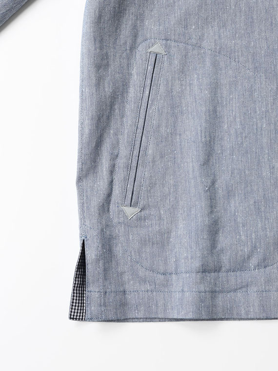 生地は、経糸に光沢のあるリネン、緯糸にコットンとストレッチ糸を組み合わせたツイル素材を使用。経糸の白と緯糸のスレン染めカラーが織りなす絶妙な配色により、奥行きのあるシャンブレー調の表情を生み出しています。