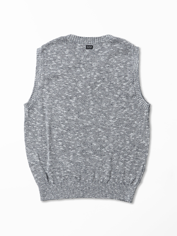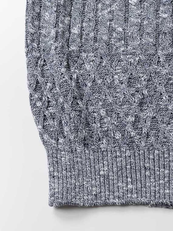 染色は綿(わた)の状態で行うことで、奥行きのあるメランジ感を表現。組み合わせたコットンには細太の意匠を持つスラブ糸を使用し、独特の撚り感とふくらみを持たせています。甘撚りに仕上げることで軽さを保ちながら、深みのある上質なカジュアル感を演出した素材です。