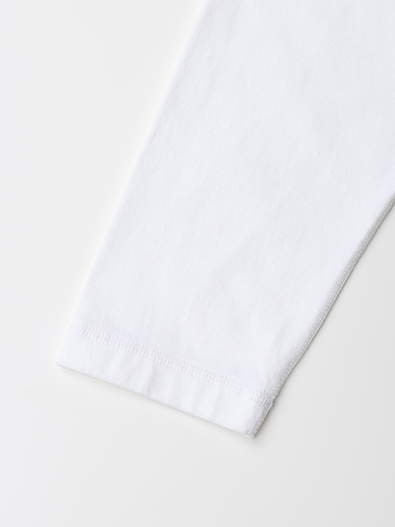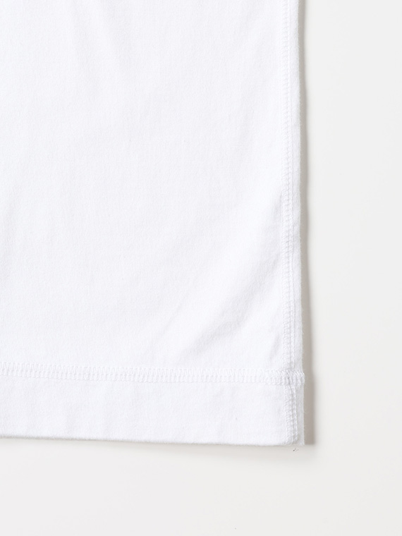定番の40/2天竺素材を使用。コーマ糸を用いることで、短い繊維を取り除き、なめらかで丈夫な糸に仕上げています。さらにその糸を2本撚り合わせて編むことで、毛羽立ちが少なく、型くずれしにくい安定した生地になります。