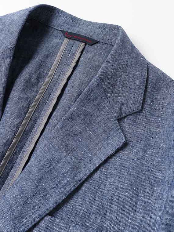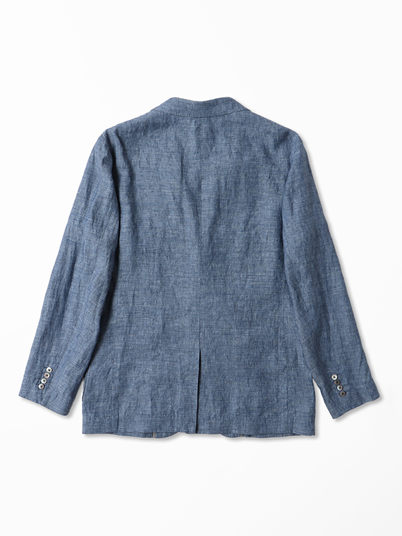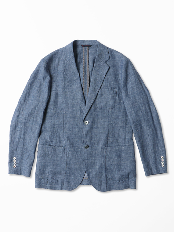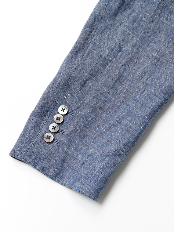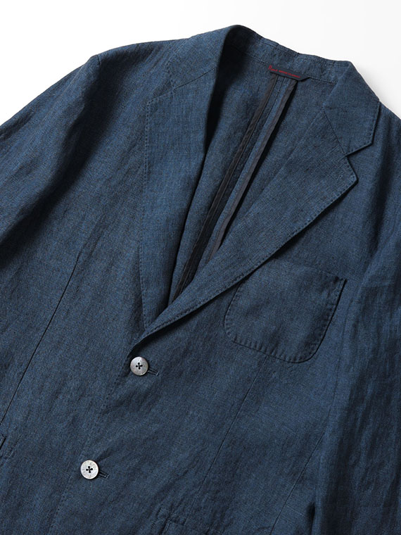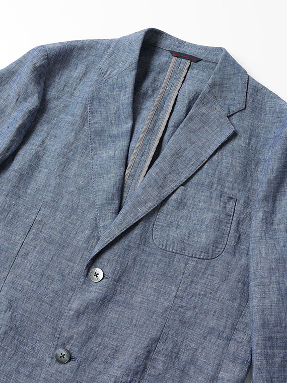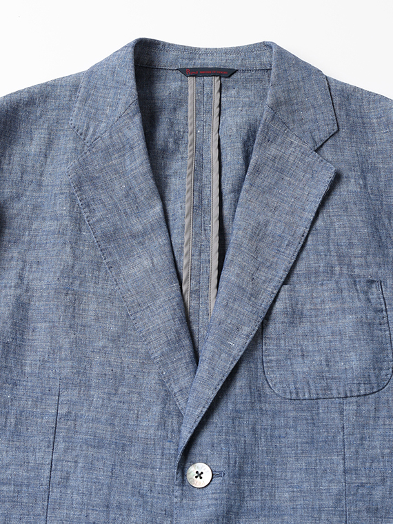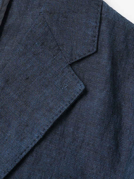 すっきりとしたシルエットにセンターベントを備え、軽快さと端正さを兼ね備えた一着です。ノッチドラペルにはAMFステッチを施し、さりげなく上質感を高めています。