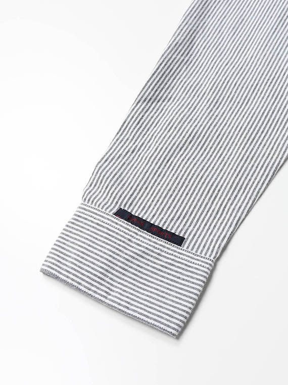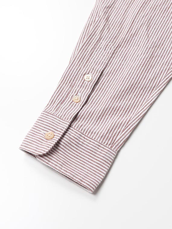 素材は、経糸・緯糸ともに80/2のコンパクト糸を使用したハイカウントのピンオックス。繊細でなめらかな質感を保ちながら、仕上げに起毛加工を施すことで、柔らかさと程よい暖かみを持たせています。ベーシックなストライプ柄の上品さに、起毛によるやさしいウォーム感とリラックス感が加わった、着心地の良い素材です。