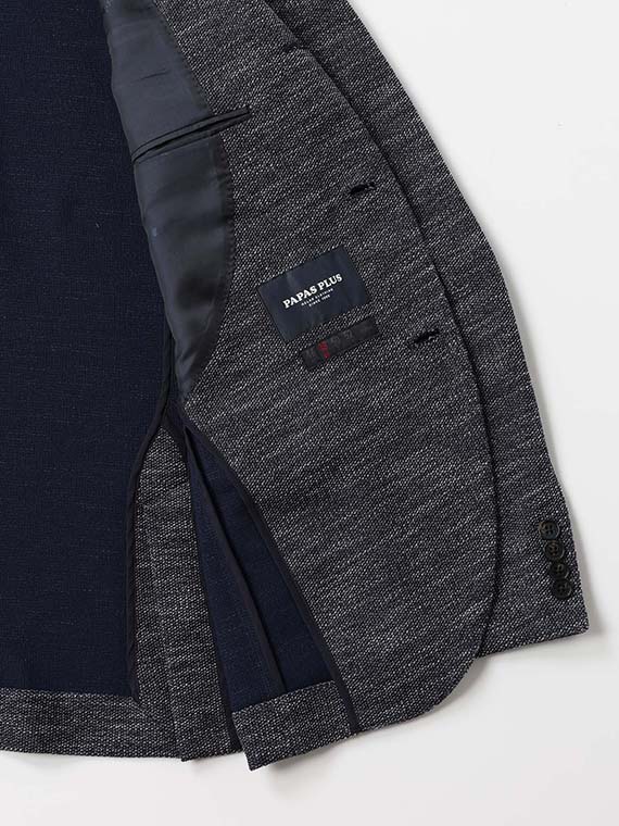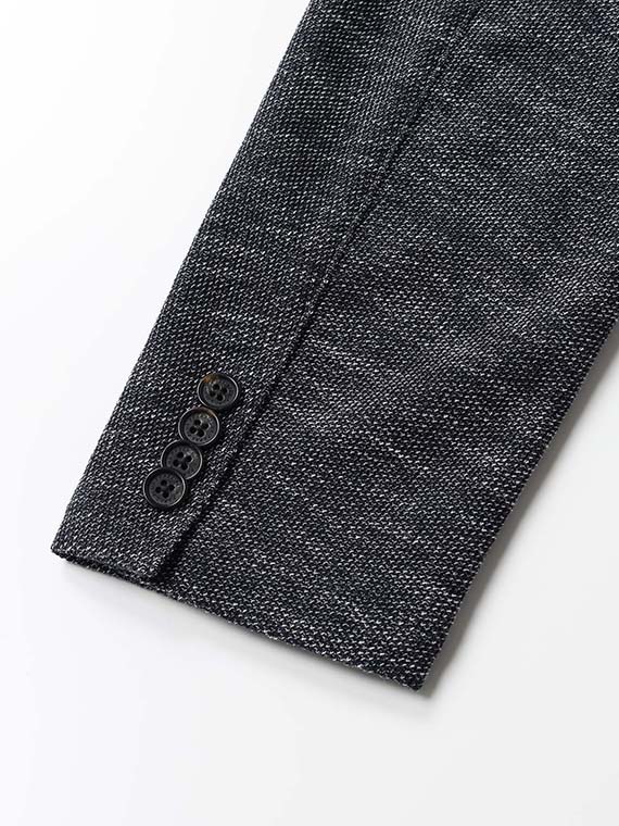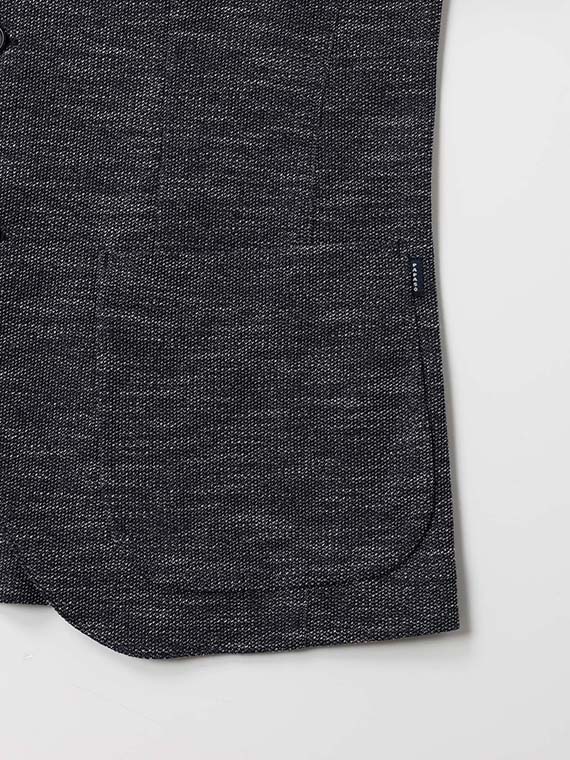 左胸は箱ポケット、腰はパッチポケット仕様。サイドベンツを入れることで動きやすさを高め、袖口はあき見せ仕様でクラシックな印象をプラスしています。左腰ポケットにはピスネームをあしらい、さりげないアクセントに。ジャージー素材ならではの快適さと、テーラードの上品さを両立した一着です。