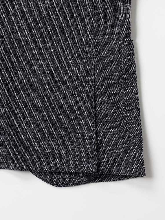 生地は、太さの異なる2本の糸を用い、凹凸感のある組織に編み立てたジャージー素材です。ミックス調の糸を使用することで、奥行きのある色合いとドライタッチな風合いを表現しています。コットンにはリサイクル100%の原料を使用し、環境にも配慮。ポリエステルを組み合わせることで軽さと扱いやすさを備えた、サステナブルで機能的な素材に仕上げています。