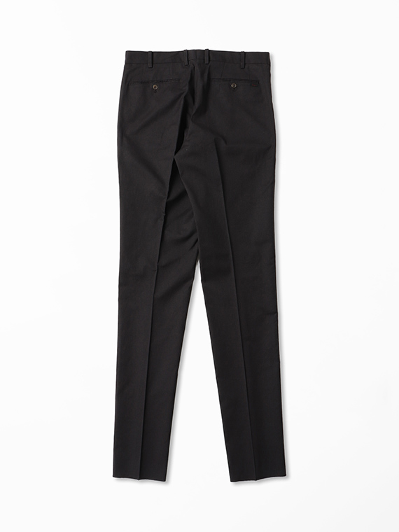 脇ポケットは使いやすい斜め仕様、後ろは両玉ポケット(釦止め)でクラシックな表情に。腰裏には無地コットンツイルの別布を使用し、細部まで丁寧に仕立てています。膝裏付きで滑りがよく、着脱や動作も快適。長くご愛用いただける一本です。