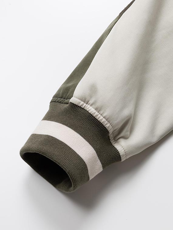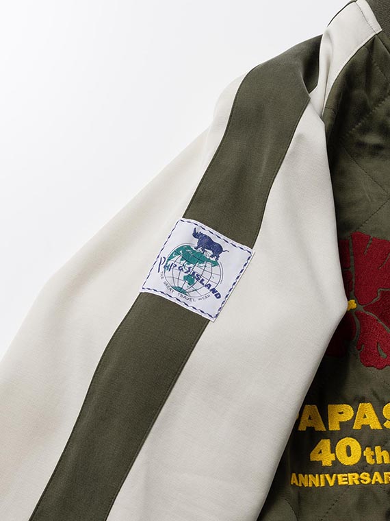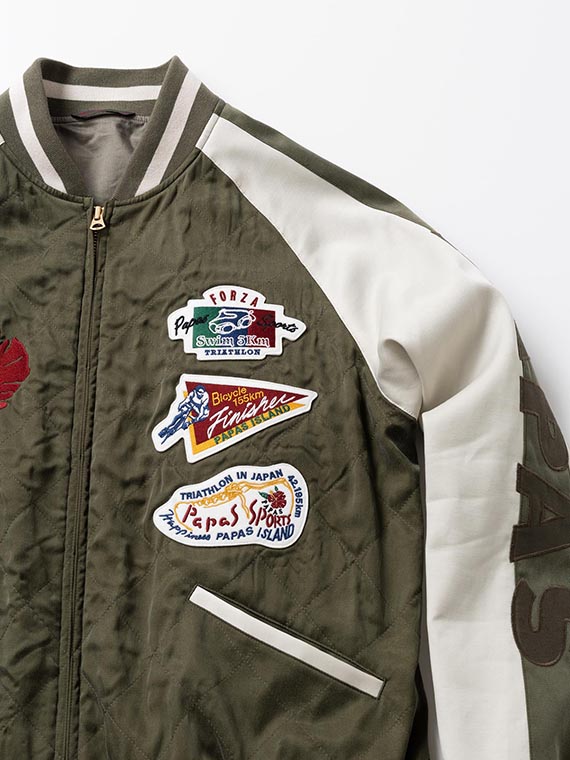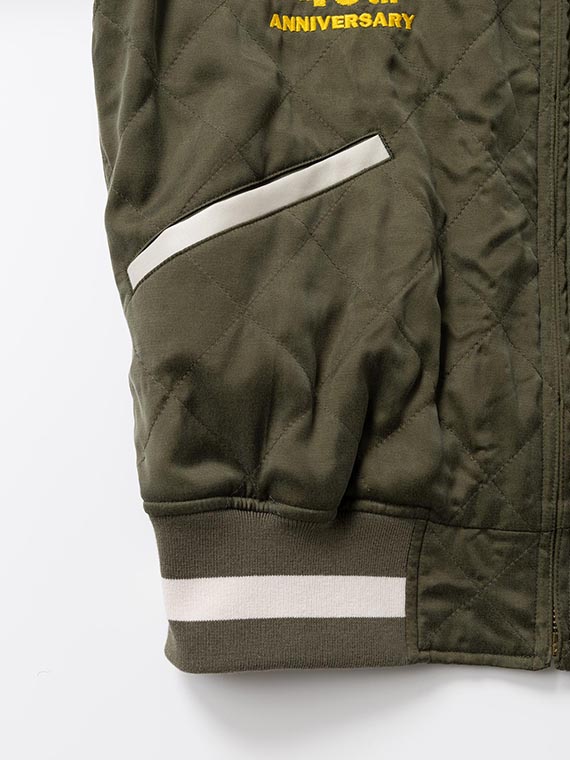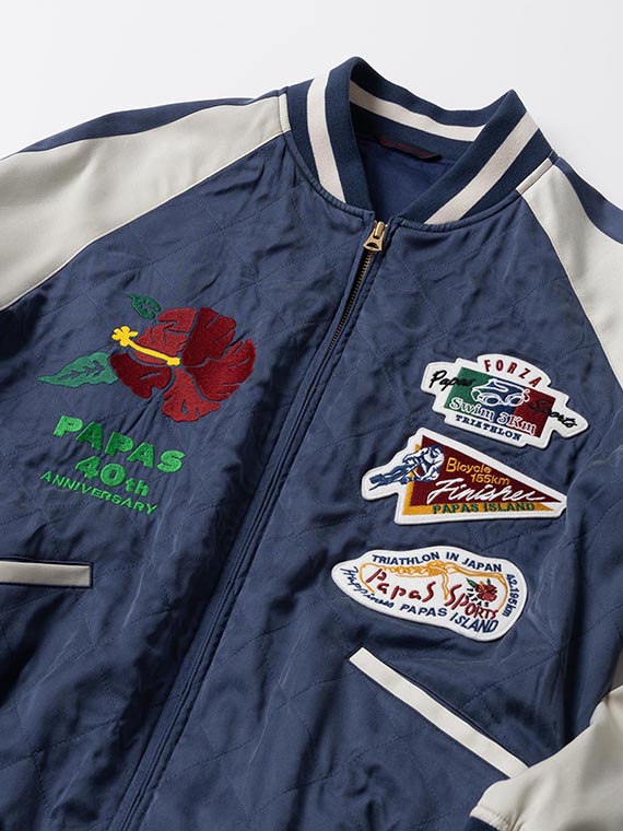 モチーフは40周年を記念し、アーカイブの中から今回の素材に映える“トライアスロン”柄をセレクト。両前身頃・後身頃・袖に至るまで贅沢にあしらい、存在感のある一着に仕上げました。ワイルドなスカジャンのデザインと、繊細で上品な素材感とのコントラストをお楽しみいただけるアイテムです。