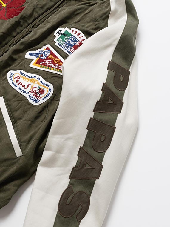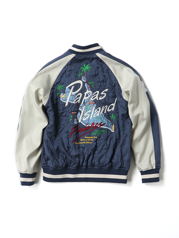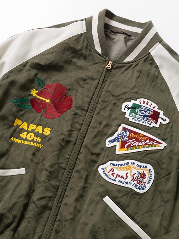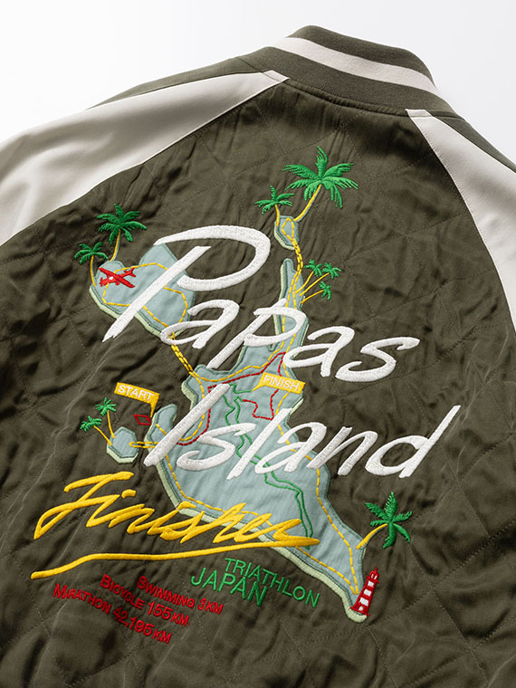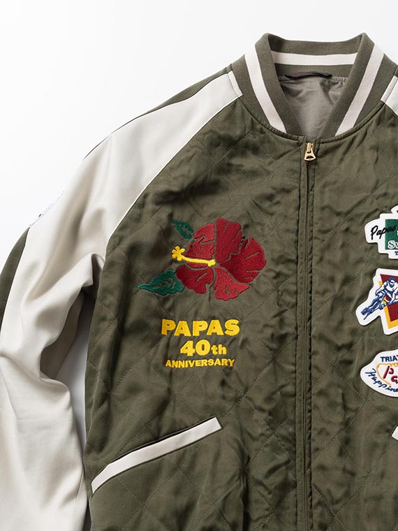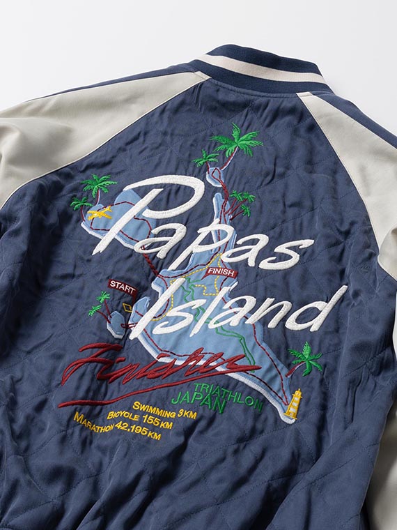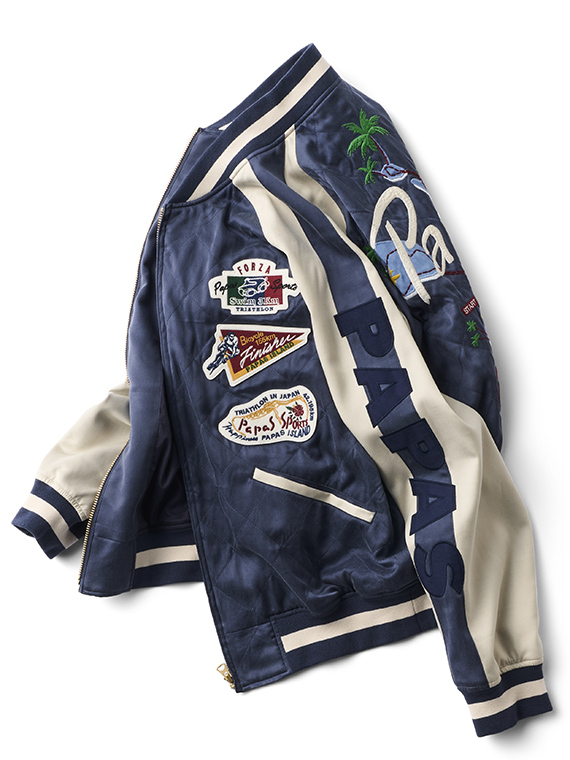 パパスが以前協賛していたトライアスロン大会の舞台、宮古島の刺繍が施された、懐かしくも新鮮なコレクターズアイテムです。パパスの遊び心が凝縮した、羽織るだけで元気になれる一着をぜひ味わってください。
