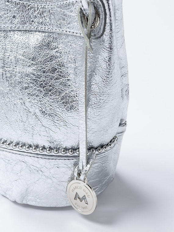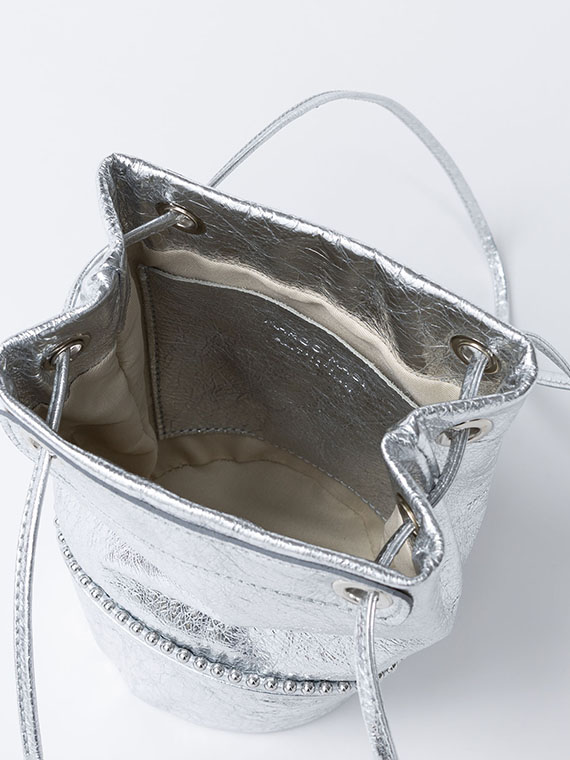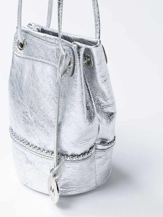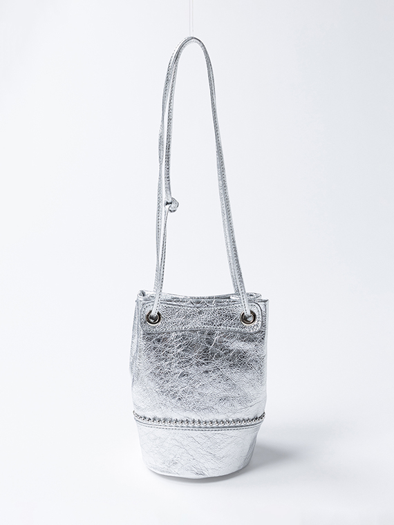 シワ加工を施したレザー生地のキャッチーな見た目と牛革の柔らかく軽やかな仕上がりを実現したトレンドデザインで、シルバー一色の統一感のある仕上がりにコンパクトなフォルムがモードな雰囲気を演出します。