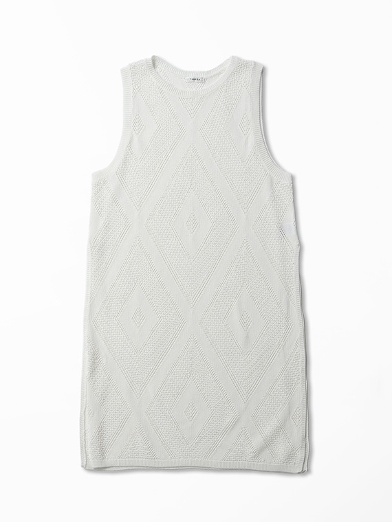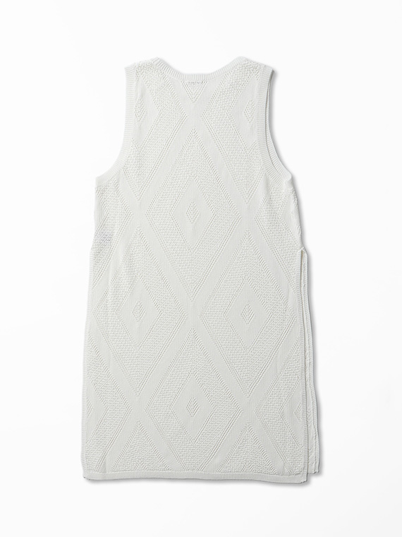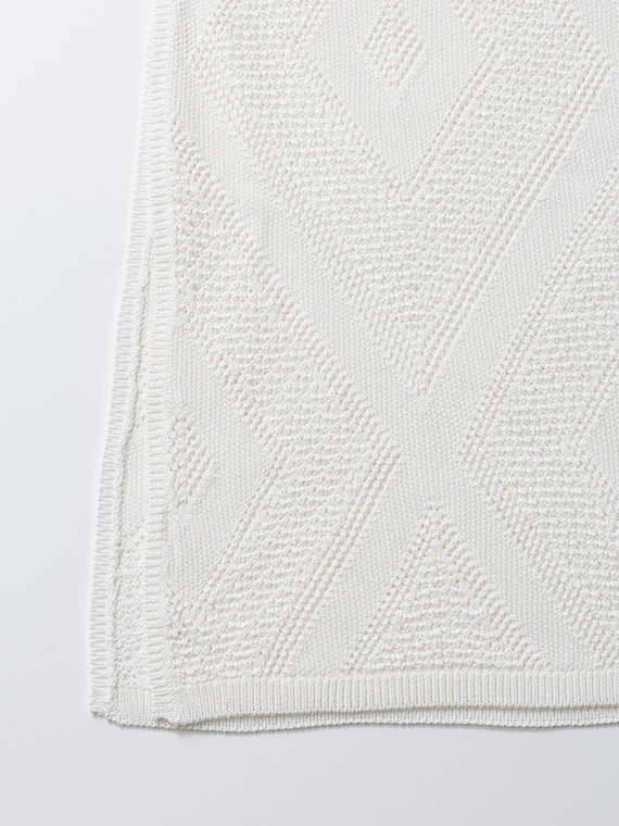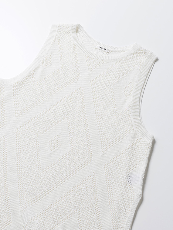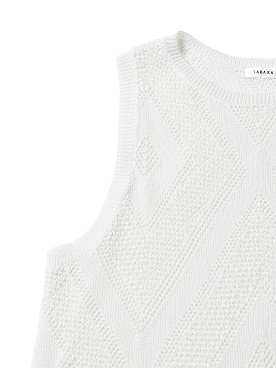 身頃全体に贅沢に並んだ大きめのダイヤ柄の透かし編みが、装いにリズムとモダンな華やかさを添えてくれます。