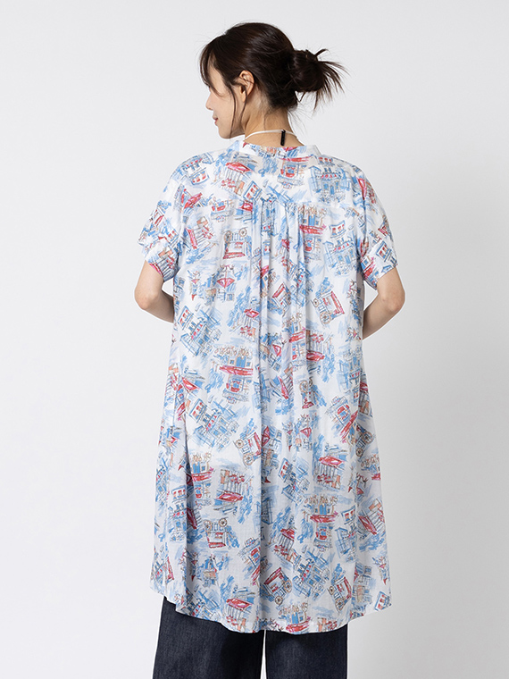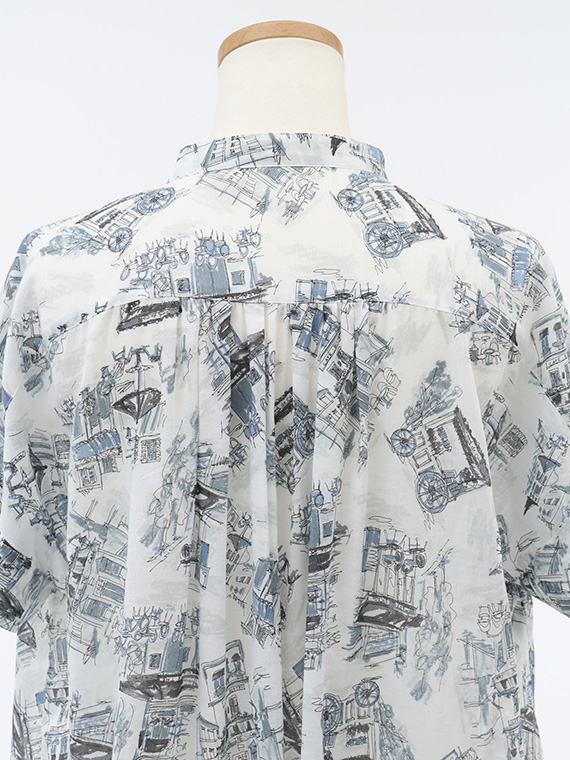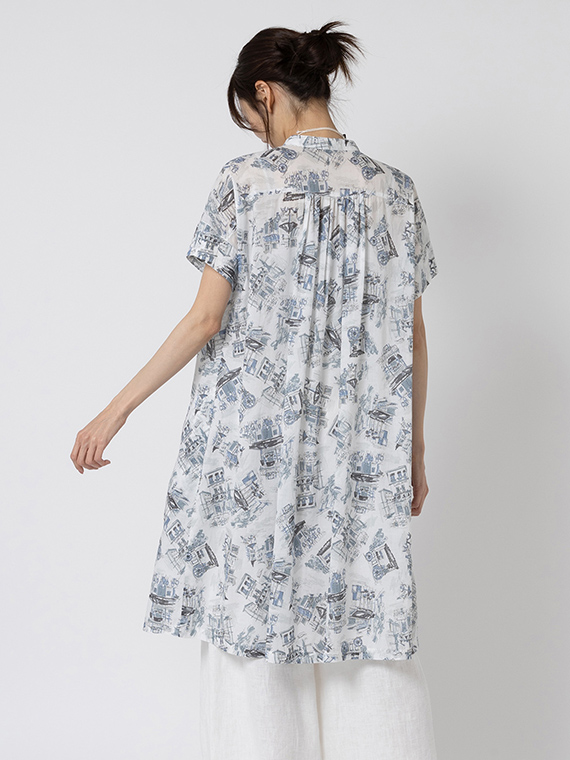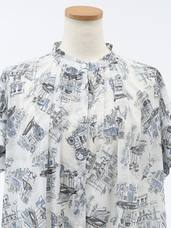 首元は端正なバンドカラーで知的に仕上げ、衿元や背中のヨーク下にはたっぷりとギャザーを施しました。