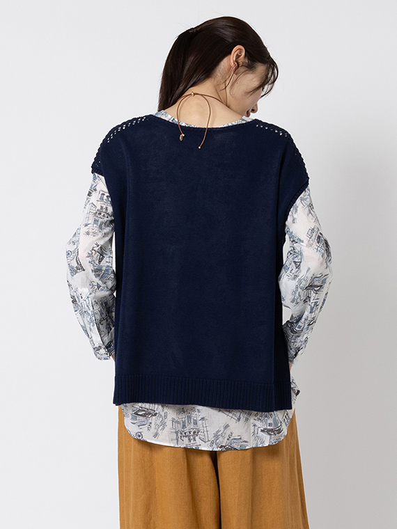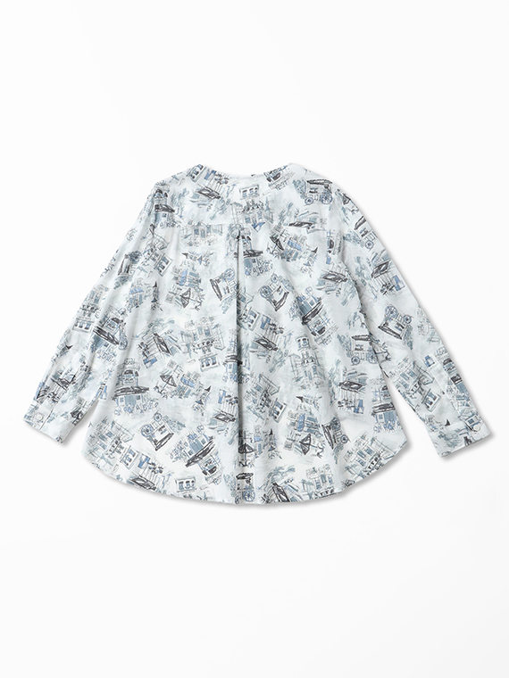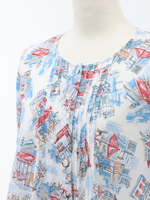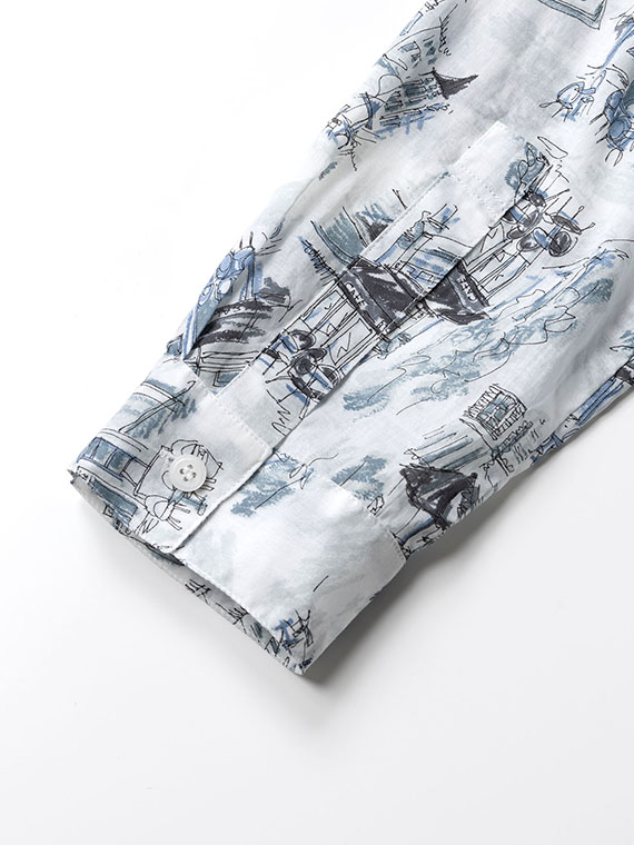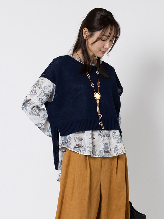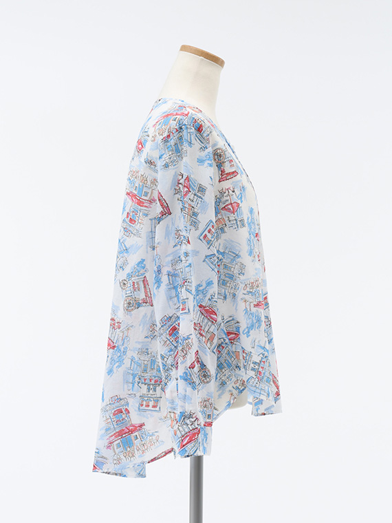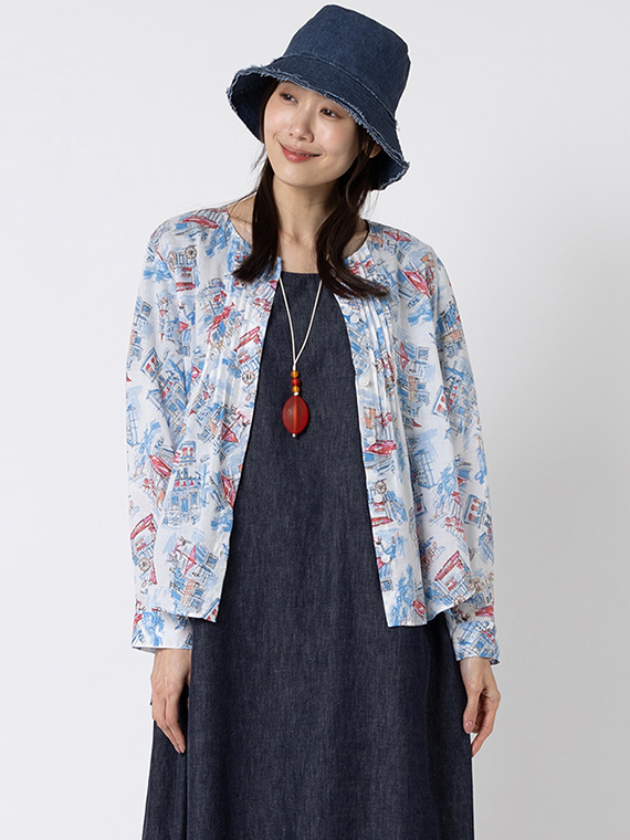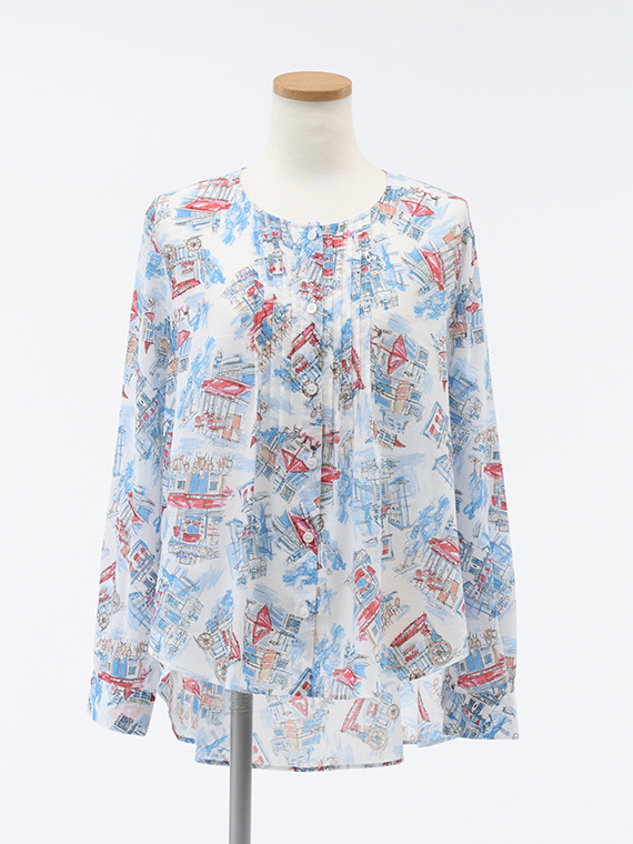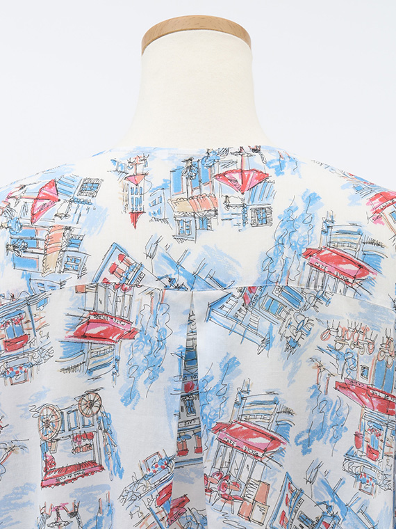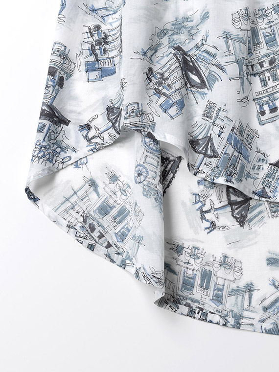 あえて透け感をもたせた素材に、軽いタッチのイラストをのせることで、プリントが浮かび上がるような奥行きが生まれました。