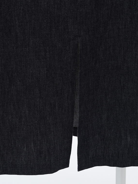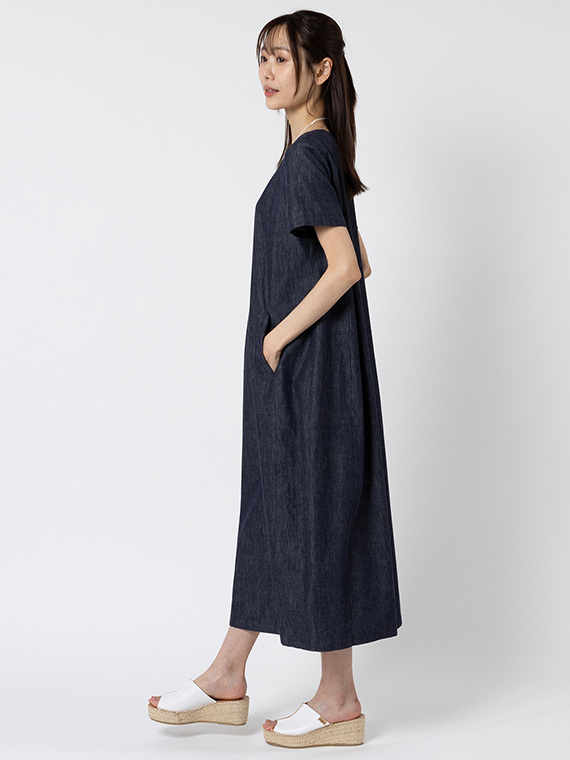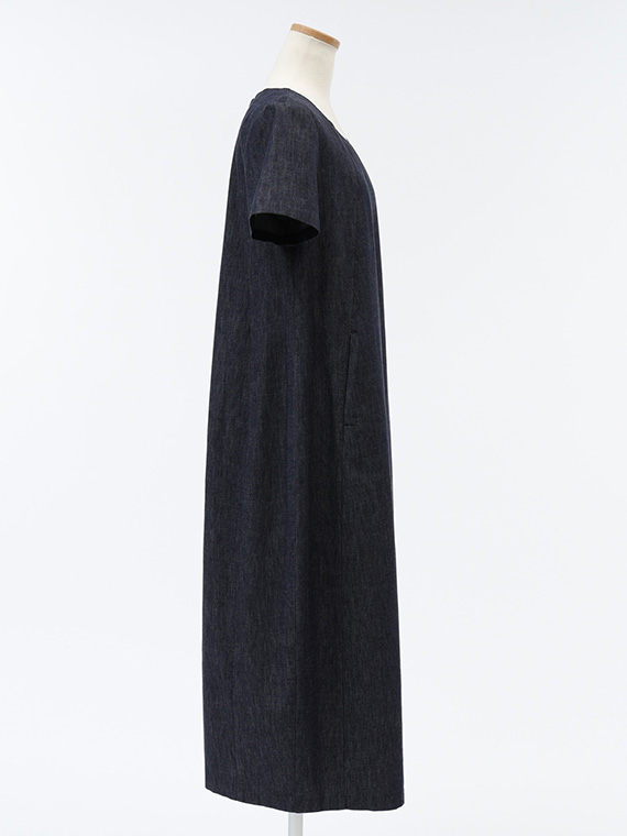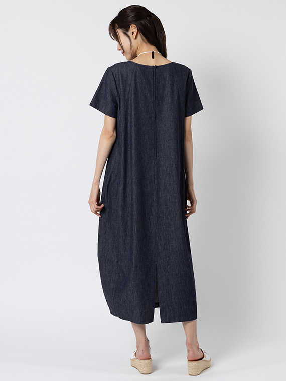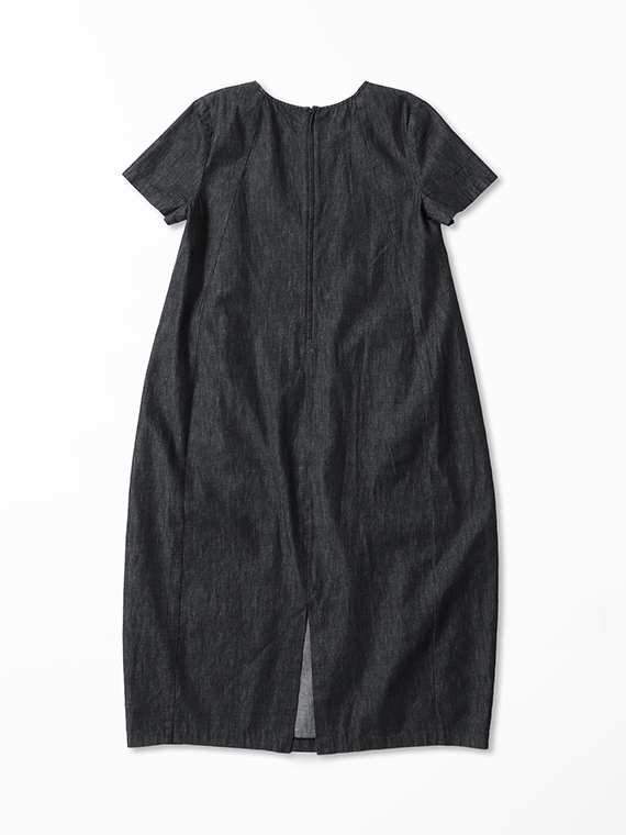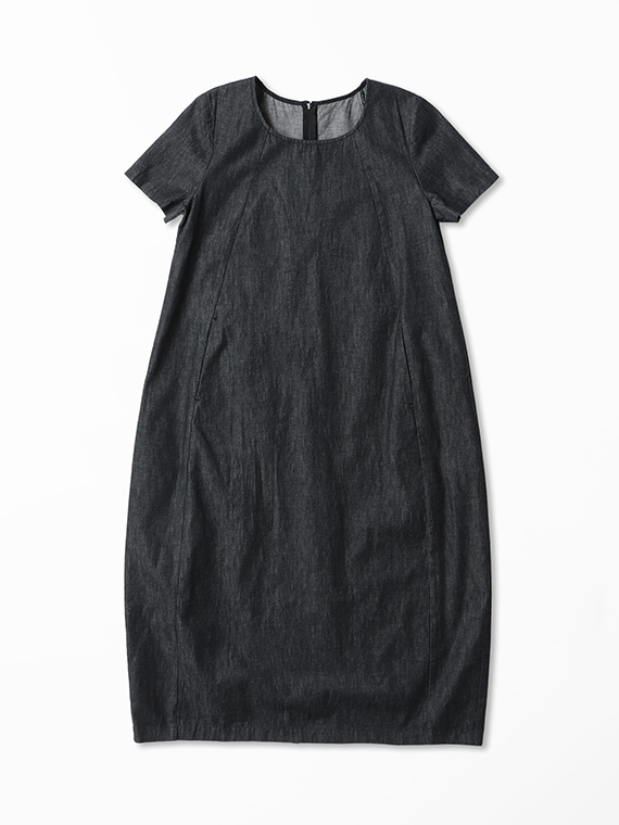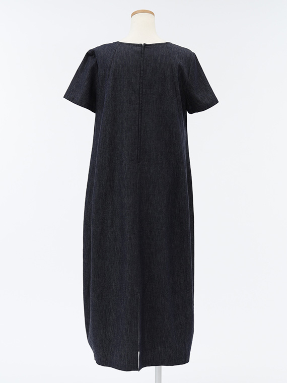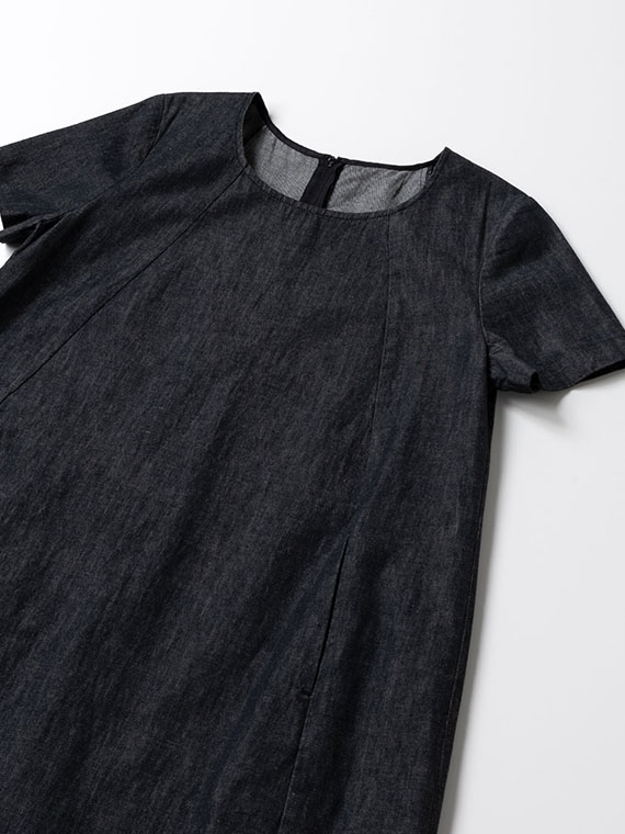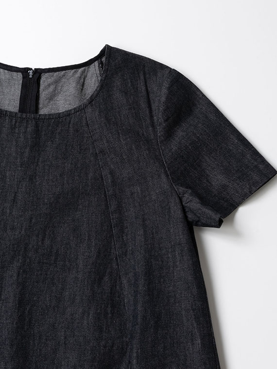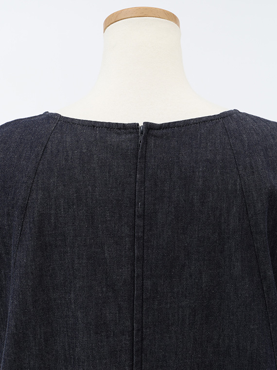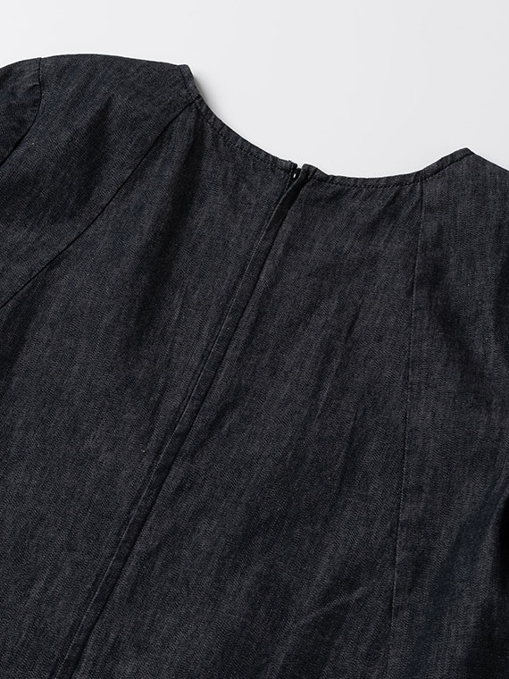広がりすぎない絶妙なラウンドネックと、後ろファスナーの仕様が、カジュアルなデニムにドレスのような品格を添えています。