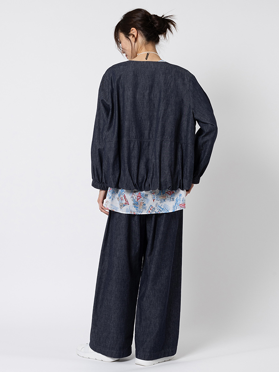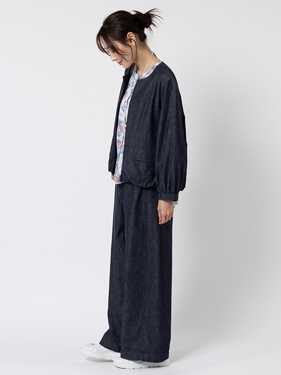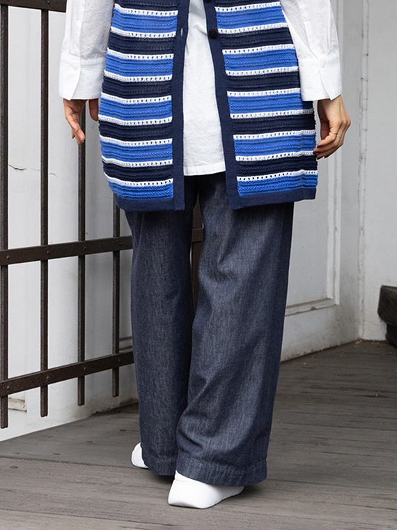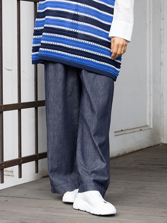 しっかりとした密度がありながら、ライトオンスならではの軽やかさと柔らかさを兼ね備えており、ワイドシルエットでも軽快な脚さばきでお召しいただけます。