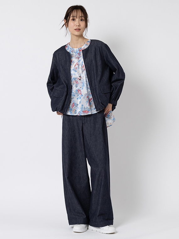 シルエットはゆったりとしたワイドですが、ステッチを生地と同色に揃えているため、カジュアルになりすぎず、とても上品な印象に。