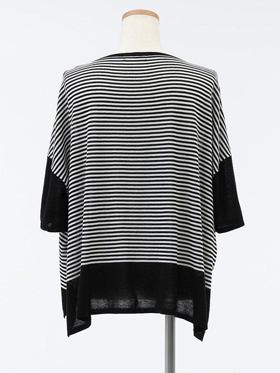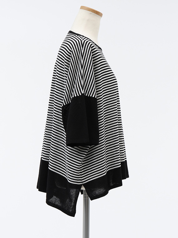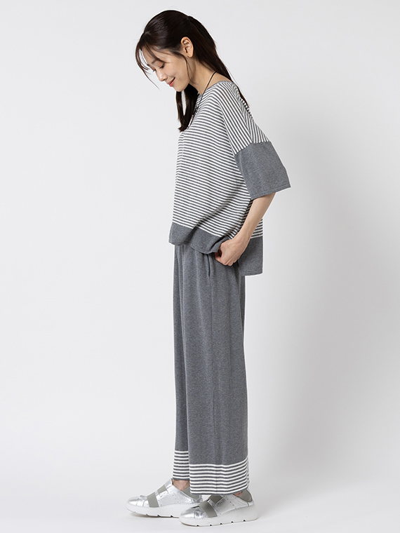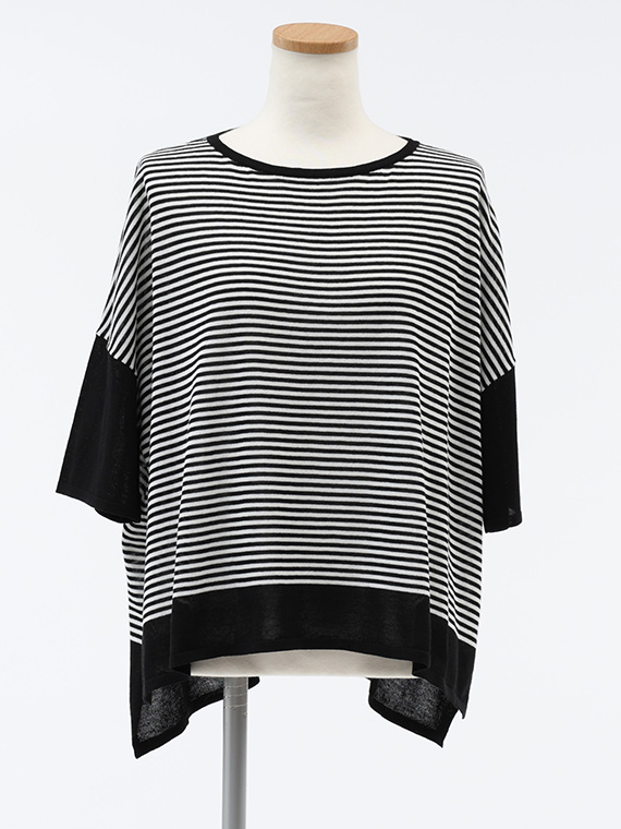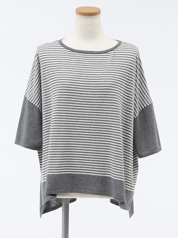 大きくドロップしたショルダーから続く短めの袖が、気になる二の腕をさりげなくカバーしつつ、軽やかな抜け感を作ってくれます。