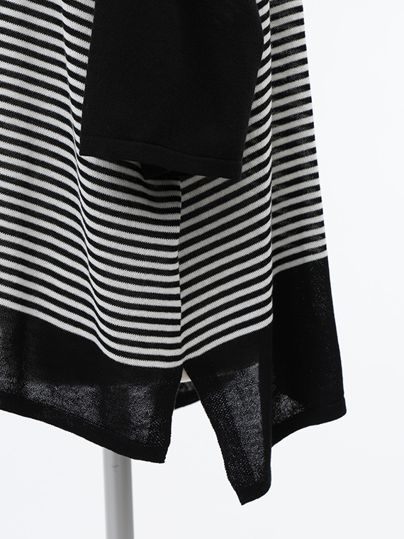 一番のポイントは、前後で長さを変えたイレギュラーな裾のラインです。後ろが少し長めになっているので、安心感がありつつ、横から見たシルエットがとてもドラマチックで、サイドのスリットがその前後を美しくつないで、動くたびに軽快な表情を見せてくれます。