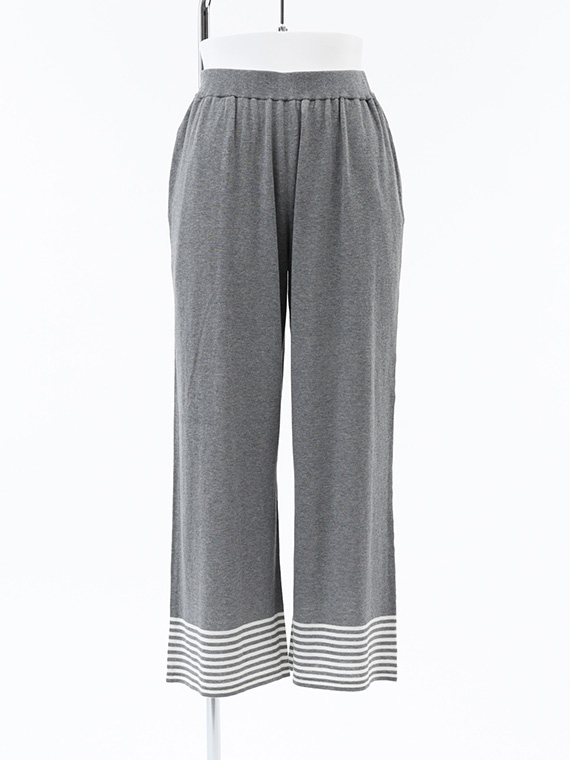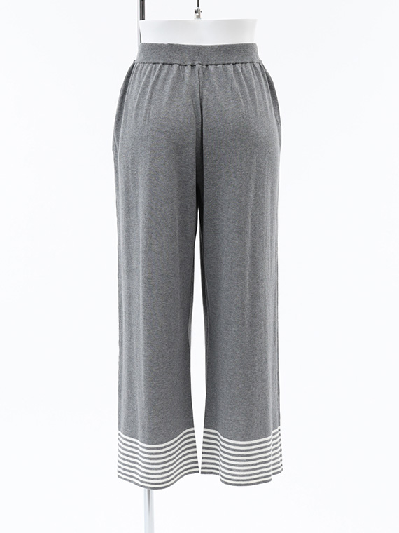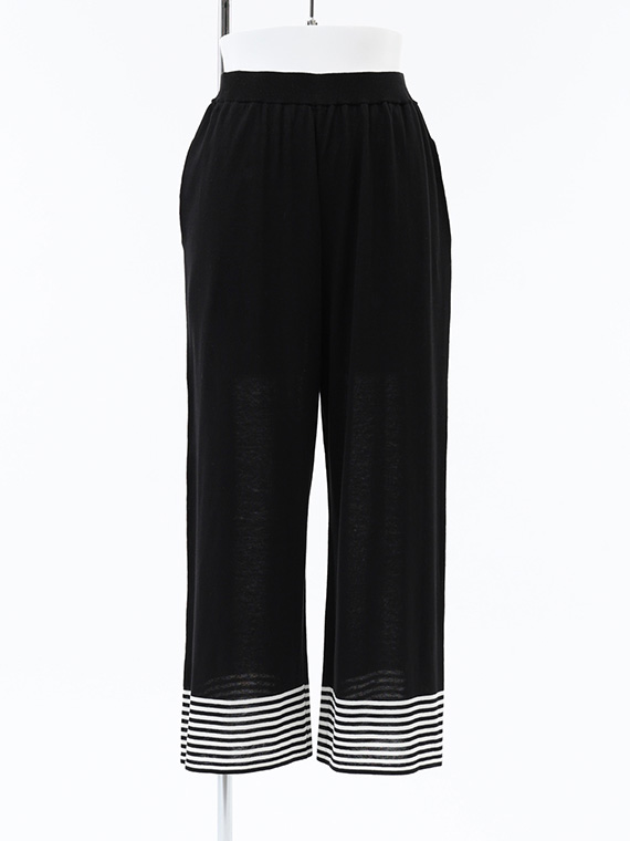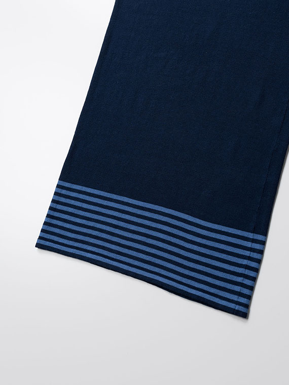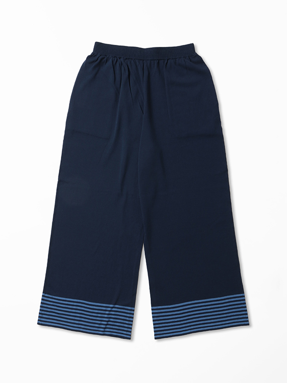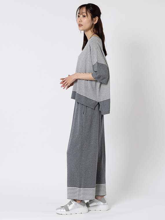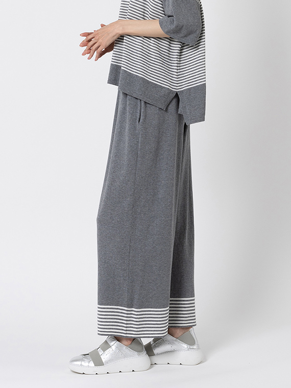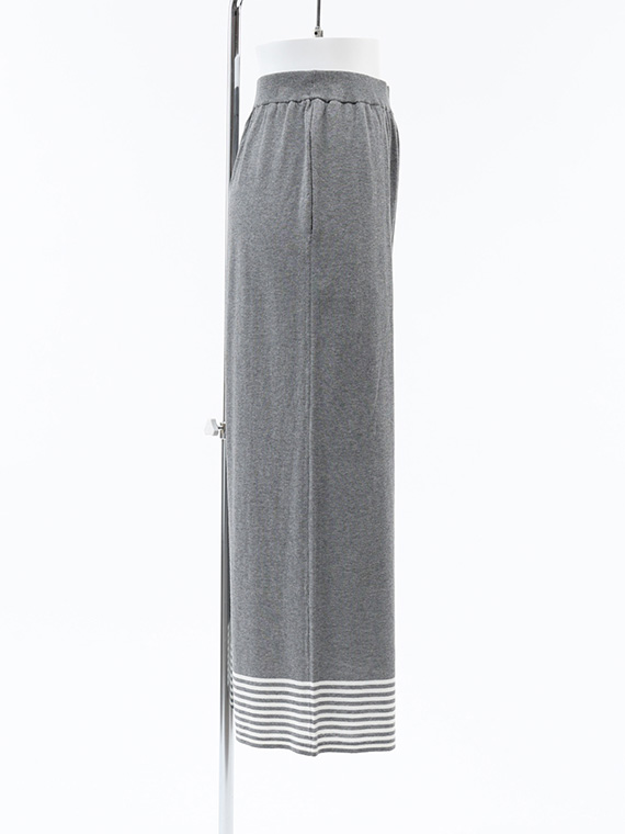 一番のチャームポイントは、裾周りの10センチほどにあしらわれた軽快なボーダー柄。足元に視線を集めることで、全体をパッと明るく、活動的な印象に見せてくれます。