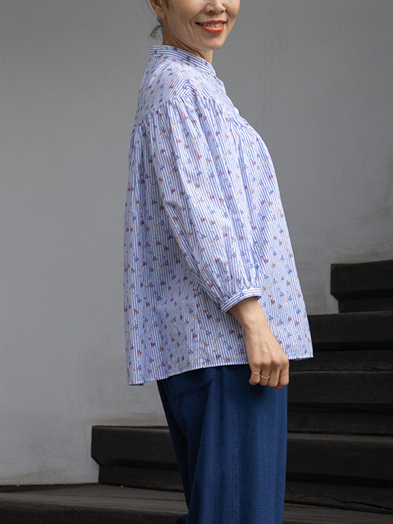 前開きタイプですので、ボタンを留めてブラウスとして着るのはもちろん、軽い羽織りものとしても重宝します。