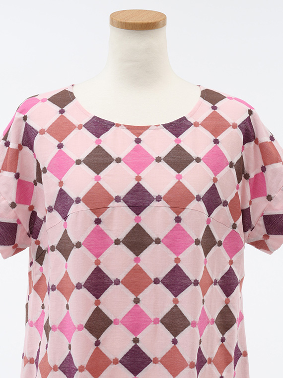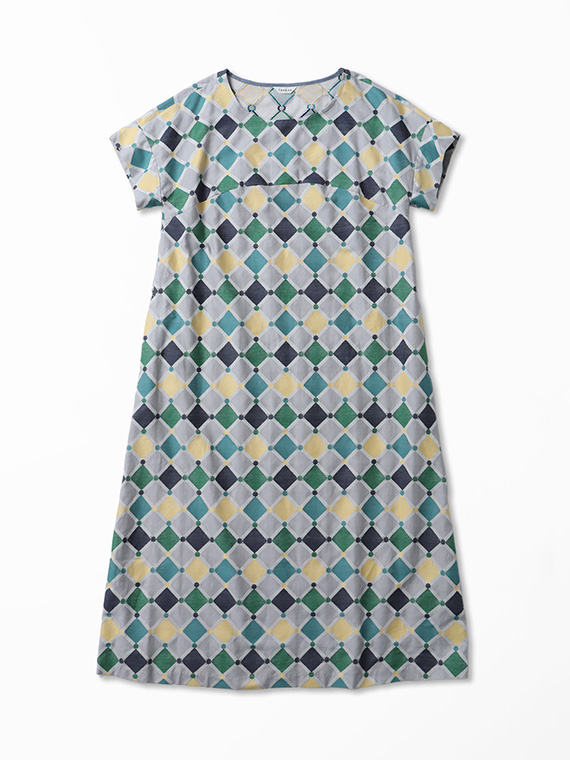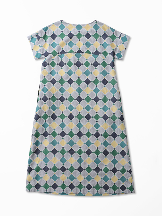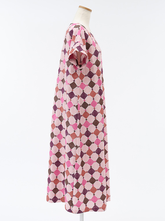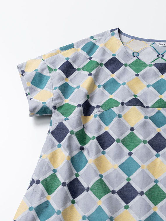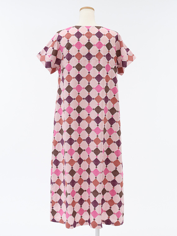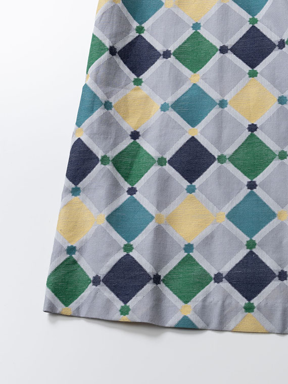 裾に向かってふんわりと広がる緩やかなAラインは、動くたびに計算し尽くされた幾何学模様が揺れ、ドラマチックな余韻を残します。