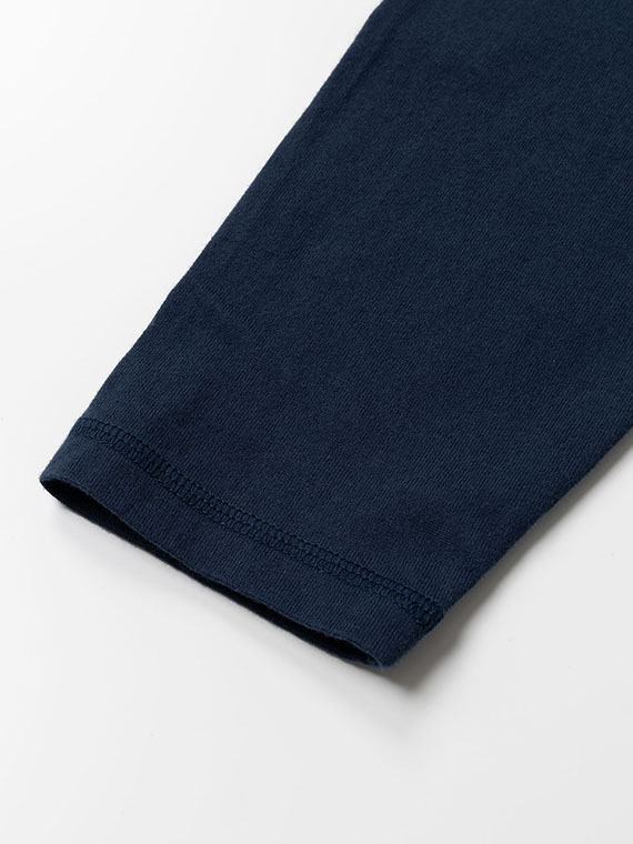 素材には、40/2の甘撚コンパクトヤーンを使用した天竺生地を採用。毛羽立ちを抑えながらも、甘撚りならではのやわらかさとふくらみ感を兼ね備えています。なめらかな肌触りと自然な光沢感が特徴で、カジュアルながらも品のある表情に仕上げました。