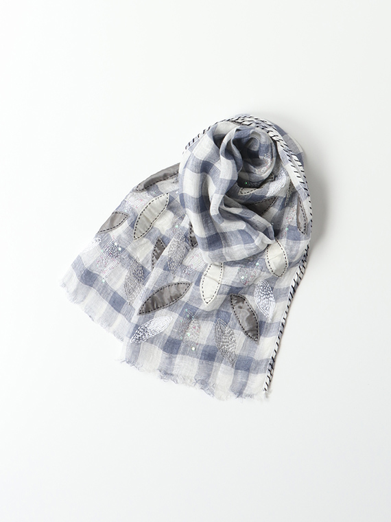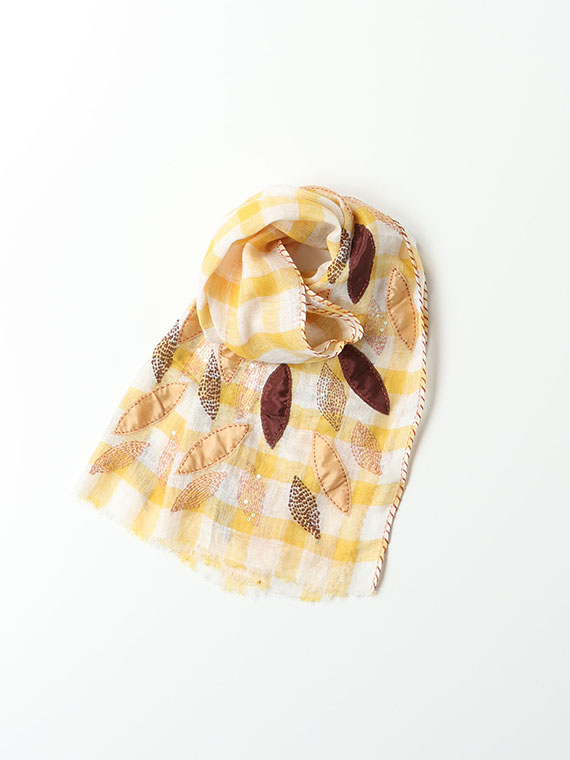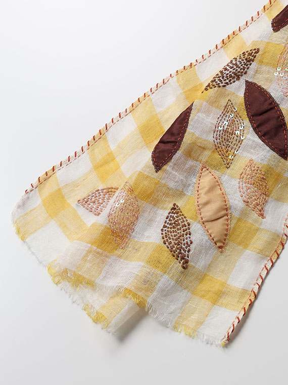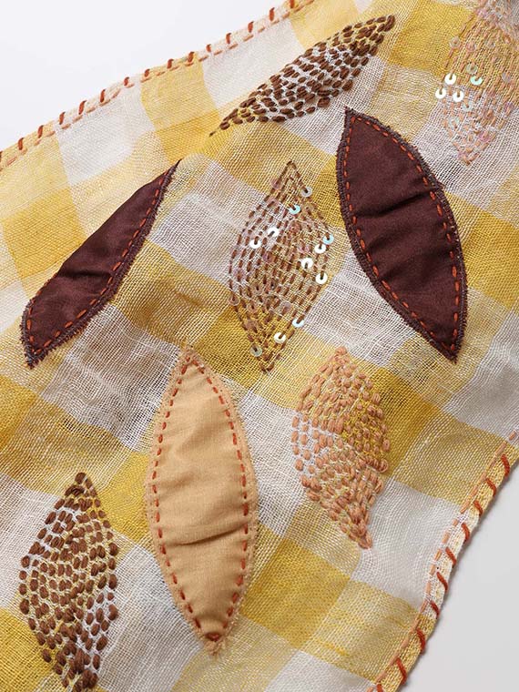 リーフ柄は、別布をチクチクとハンドステッチで留めつけたアップリケや、スパンコールや太めのステッチで立体的に表現した刺繍など、さまざまな手法で表現されて、インドらしい奥行きのあるアート感があふれています。