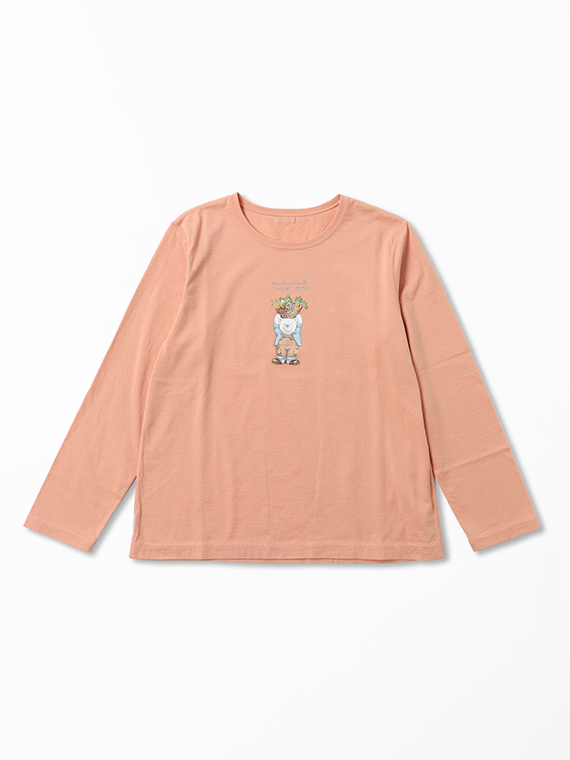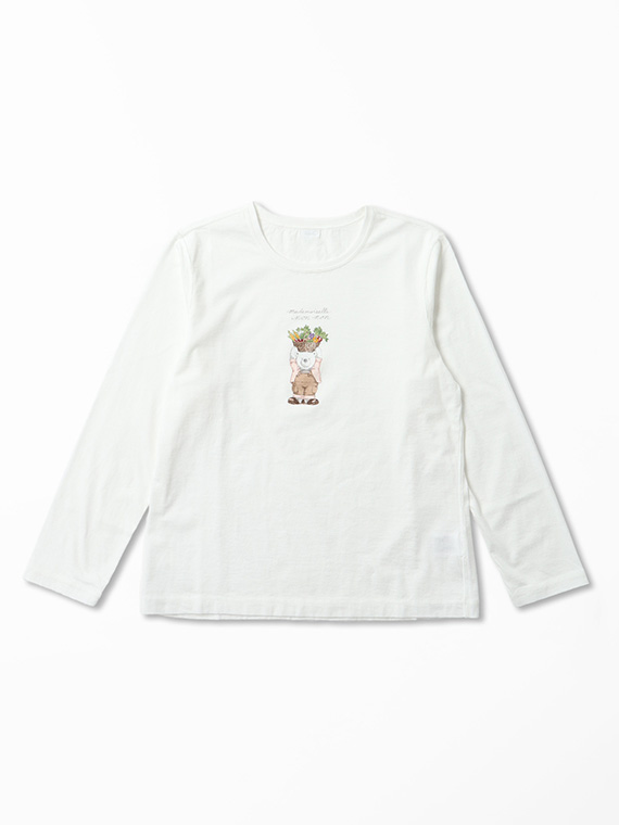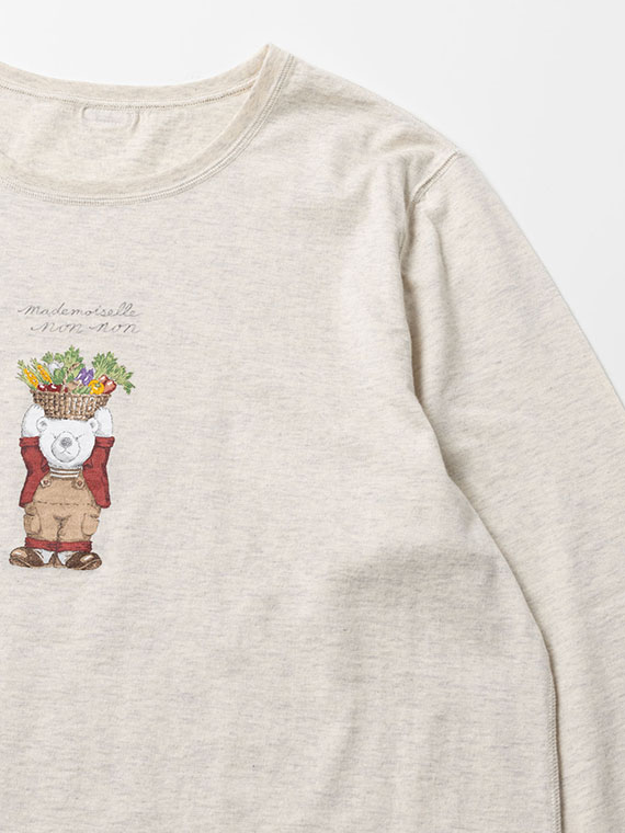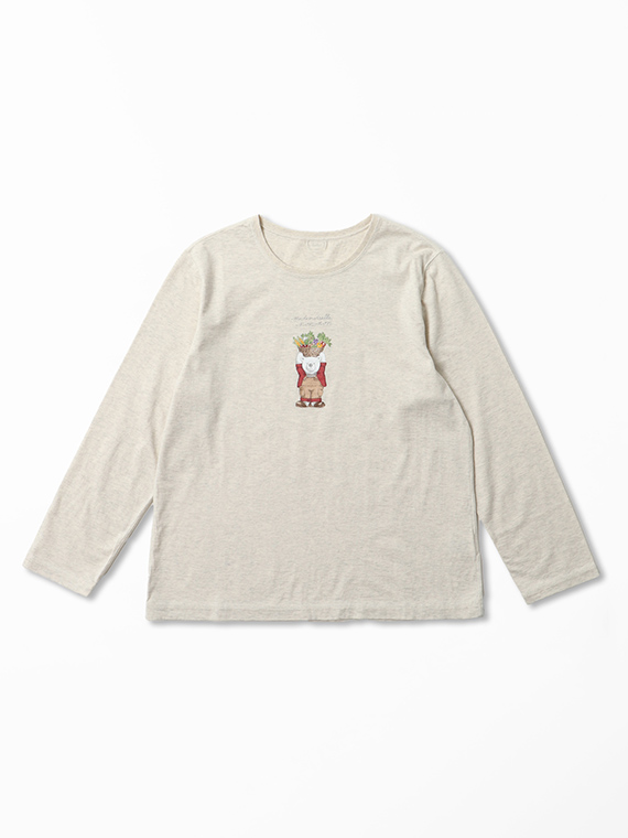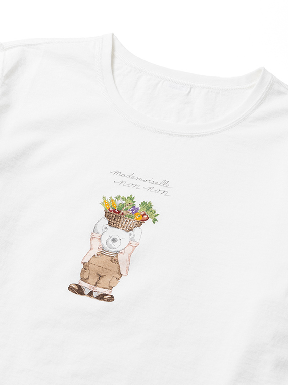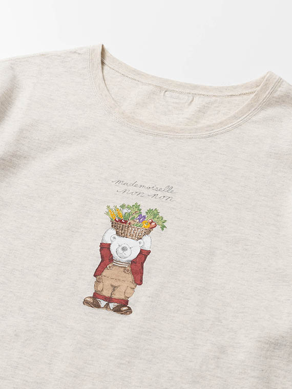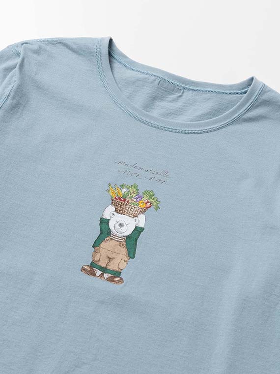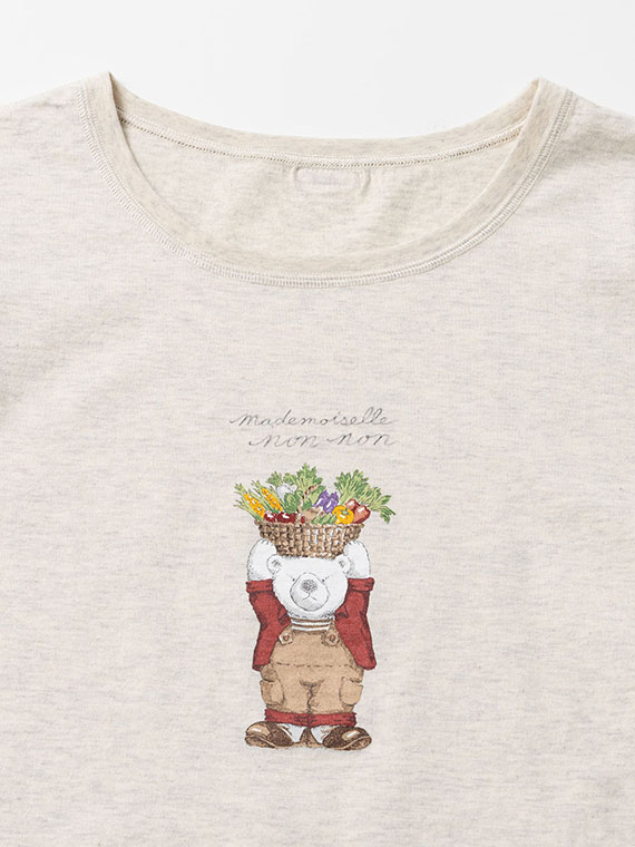 胸元には14色の多色プリントで描かれた、愛らしい「ベジタブルベア」をあしらいました。 しっとりと心地よい肌触りで、ご自宅で手洗いできる扱いやすさも魅力です。