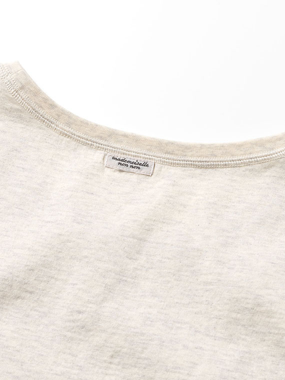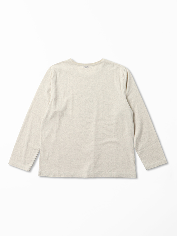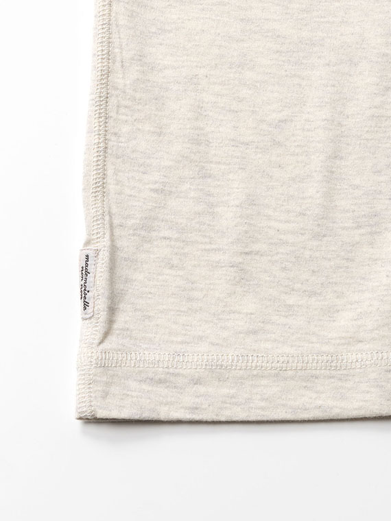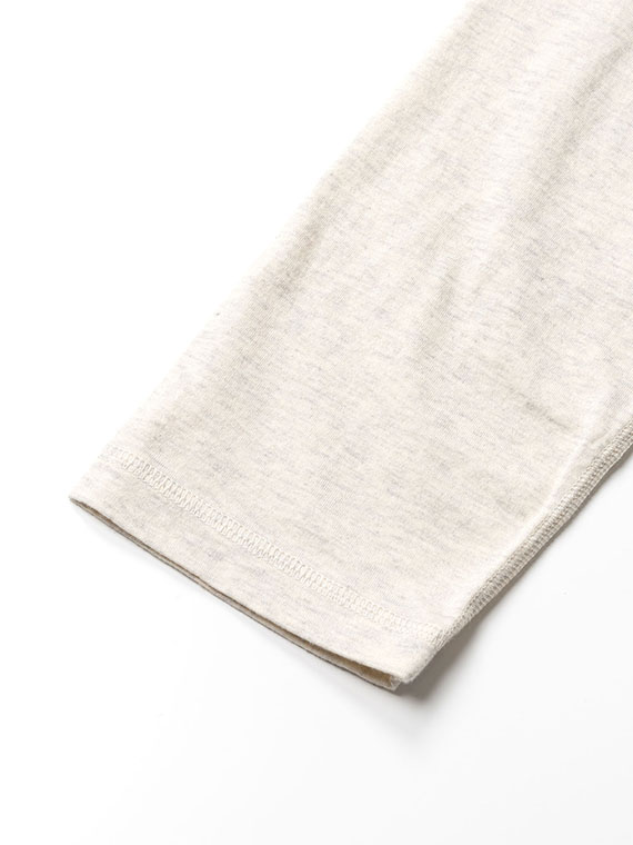 60/2コンパクト糸を使用しています。2本の糸を同じ撚り数にして、丁寧に双糸加工を施すことで斜行を軽減しています。染色はなるべく化学薬品は使用せず、生地に負荷をかけずに、優しく、丁寧に、空気を含ませながら染色しています。コンパクト糸の綺麗な表面感と肌触り、環境に優しい染色方法で仕上げた着心地の良い天竺です。