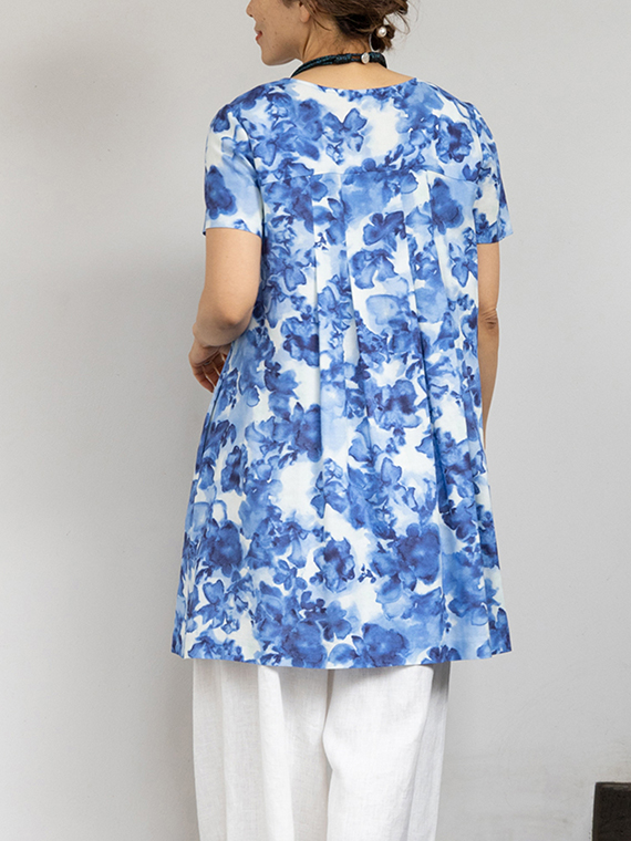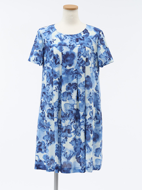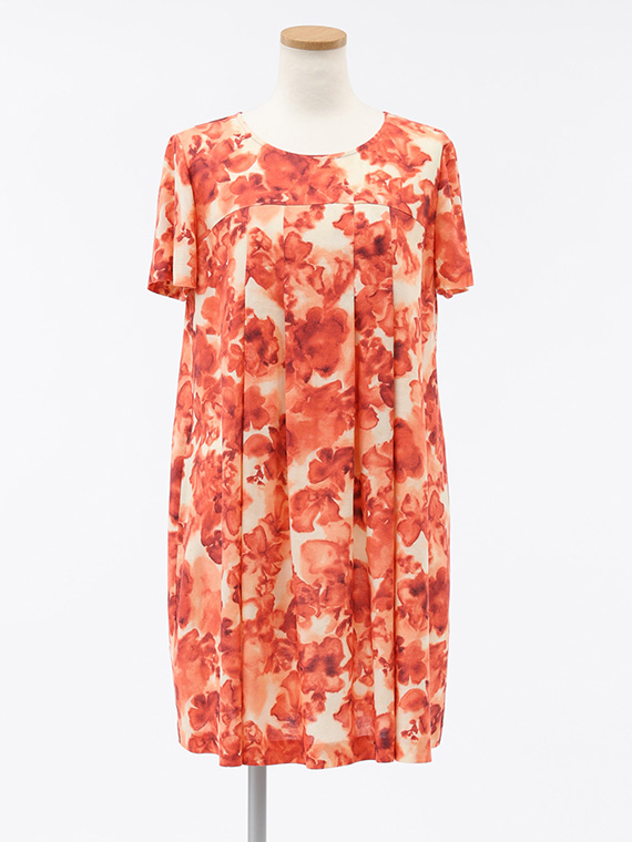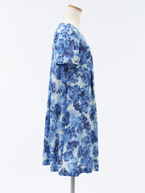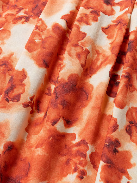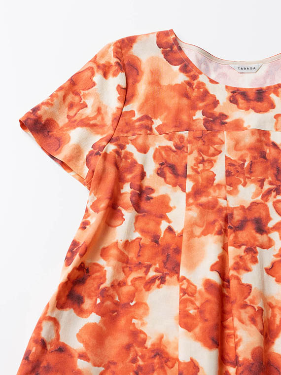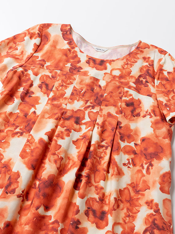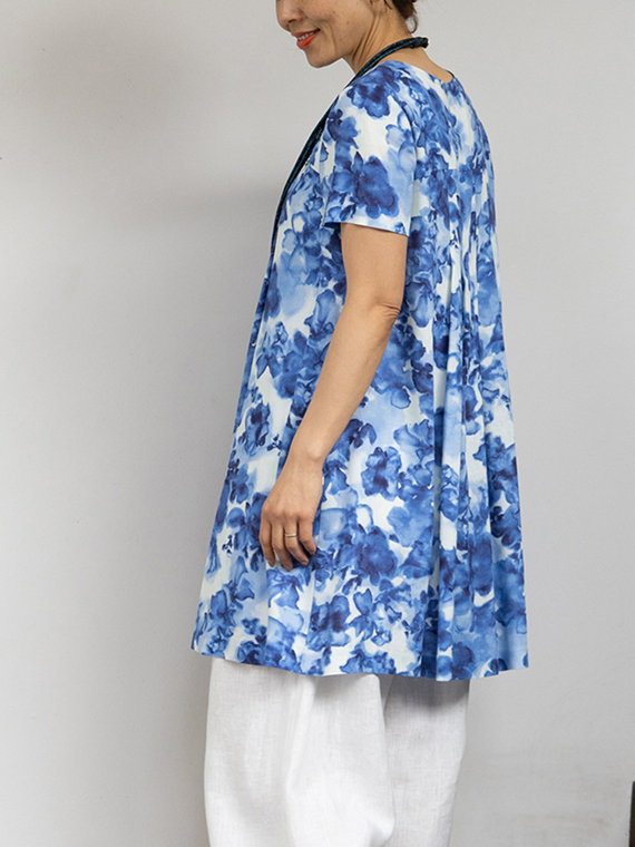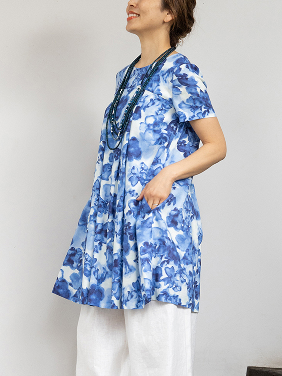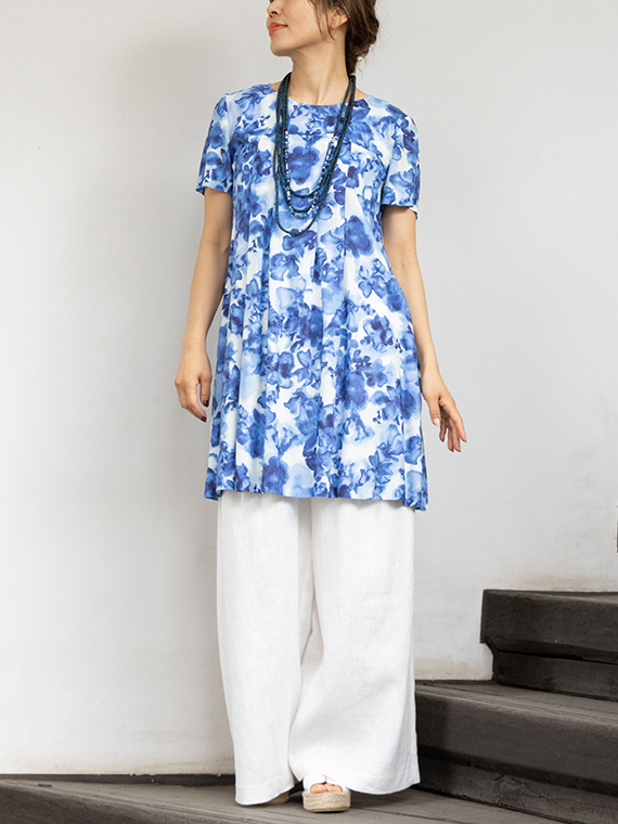 肌に触れるとさらりと涼やかで、汗ばむ季節でもベタつきにくいのが魅力。それでいて、動くたびにしなやかに揺れるドレープが、プリントの奥行きをさらに深めてくれます。