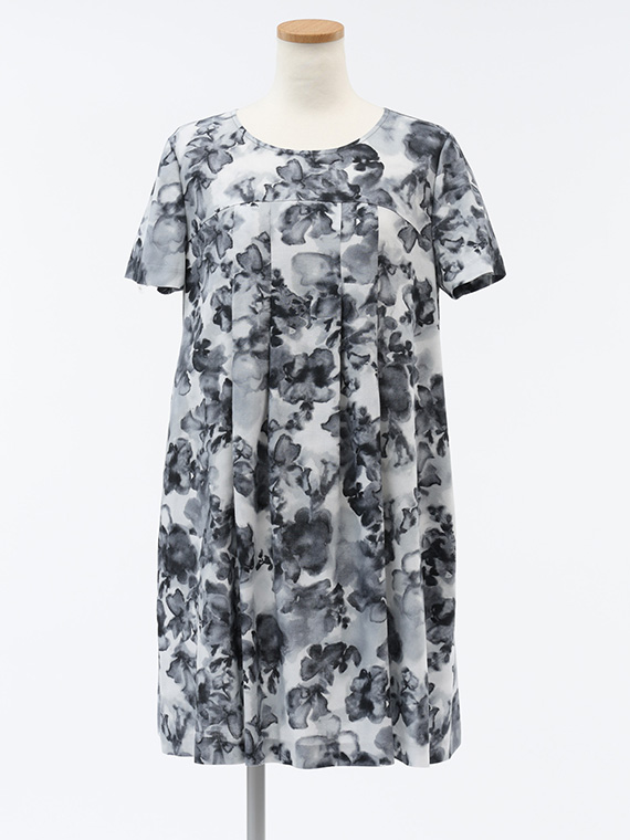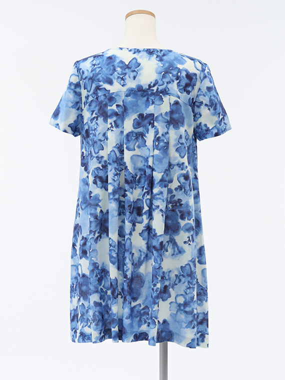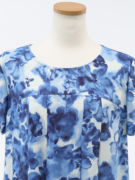 胸の高い位置で切り替えを入れ、そこから左右に2本ずつ丁寧にタックを施したチュニックです。