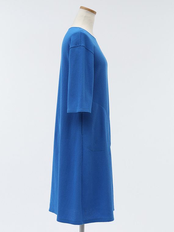 丸首の首元は開きすぎず、上品な印象。もちろん両脇にはポケットが付いていますので、スマートフォンやちょっとした小物を入れて、軽快に動いていただけます。