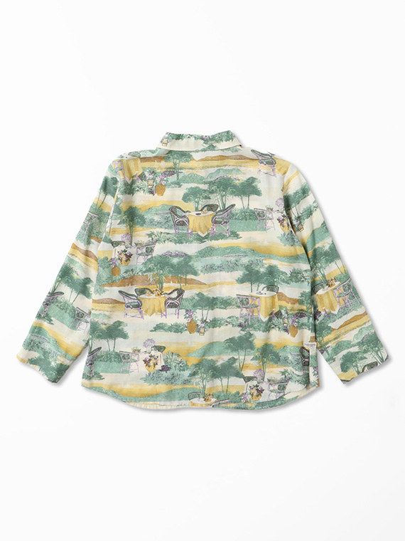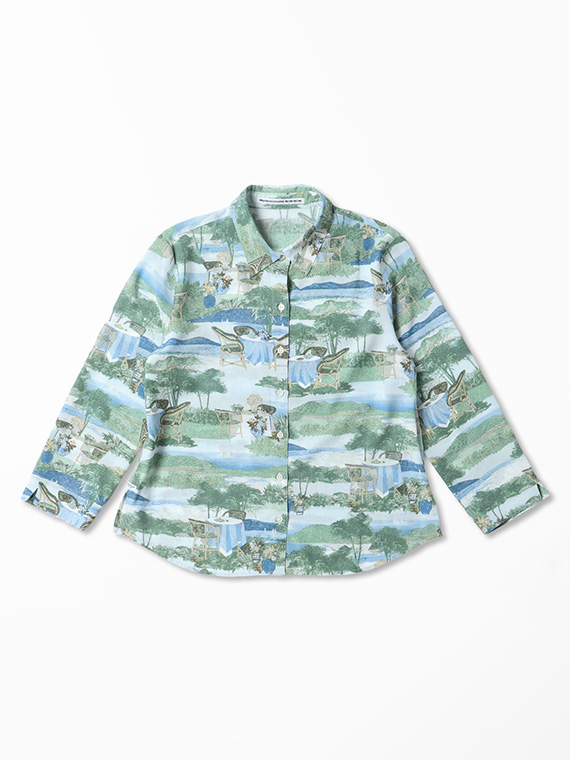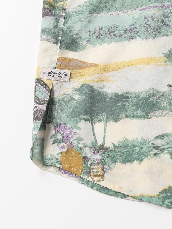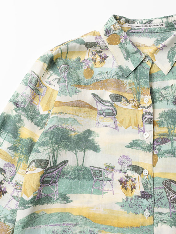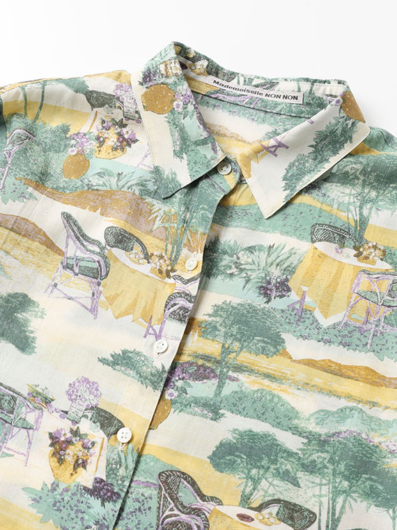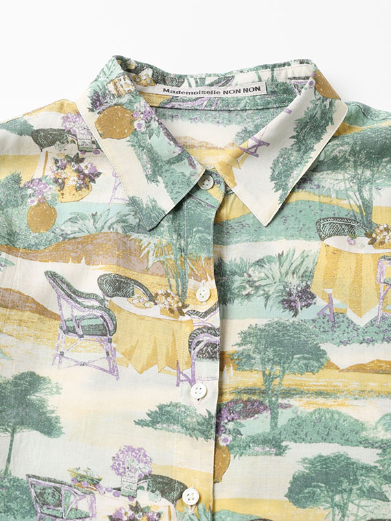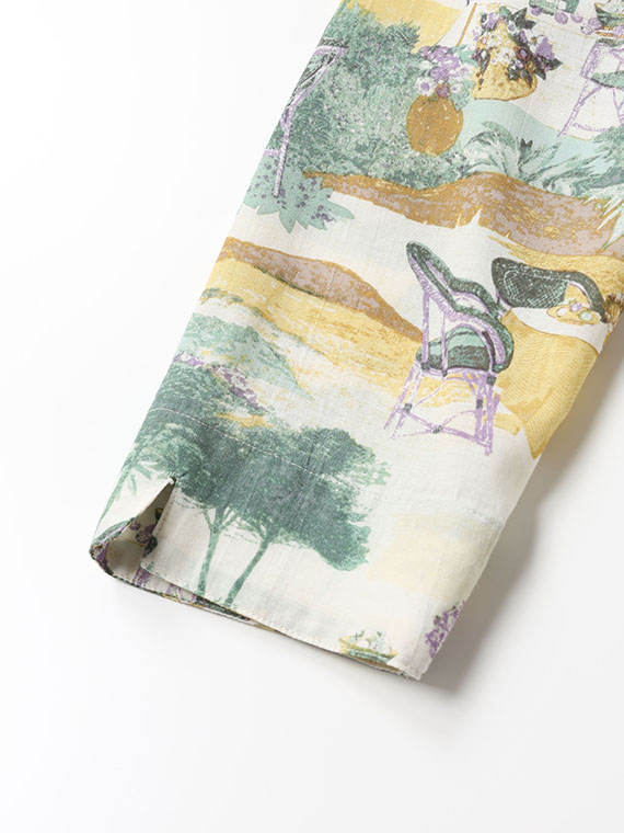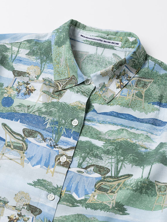 こちらの下生地は、糸にレクセル・マイクロモダール・扁平レーヨンの3種類の糸を使用して平織りに仕上げた生地です。再生繊維糸のレクセルとマイクロモダールは天然の木材を溶かして細いノズルから糸を抽出してその糸で織り上げ、そこに扁平レーヨンをブレンドして生地に仕上げたものです。綿に比べてナチュラルな光沢感と適度なハリコシ感があり発色性にも富んでいますのでプリント下生地に最適な素材です。フランスのテラスから海が見える風景というイメージで、軽めのタッチで風景画の総柄構図でプリント柄を作成しました。