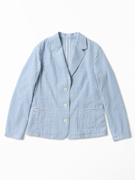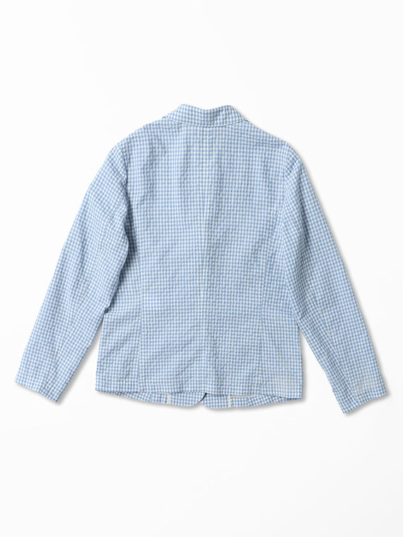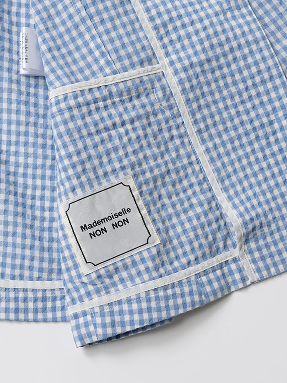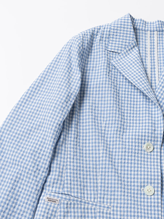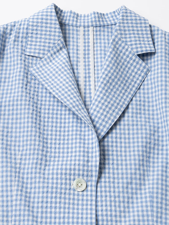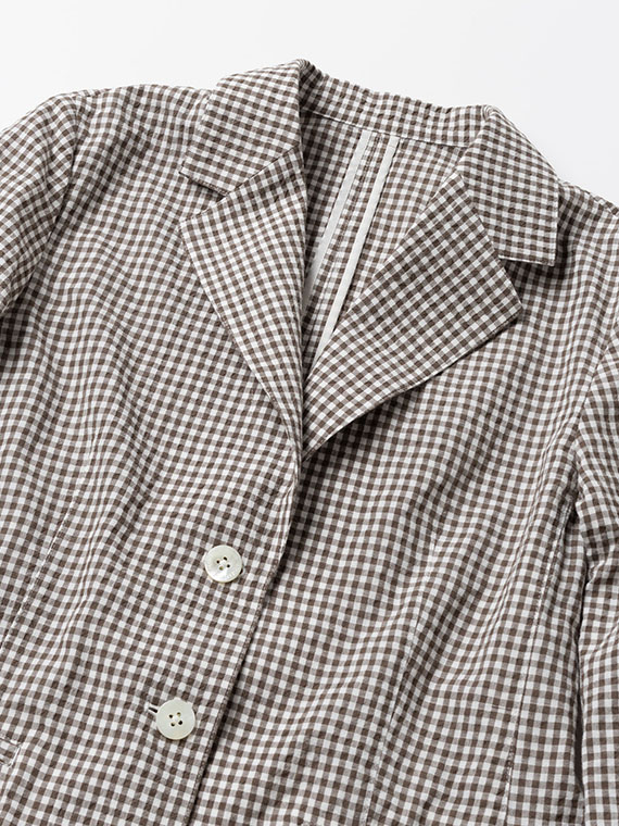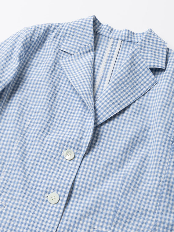 色ごとにコットンとコットンポリエステルの糸を織り分けて縮率の差と若干の番手差によってポコポコとした凹凸感を出したギンガムチェック素材です。最初の仕上げ工程でよく揉み込んでワッシャーし、リラックスして乾燥させることでコットンサイドがグッと詰まって凹凸感が生まれます。ドライなタッチでシワにもなりにくい表情豊かな素材です。