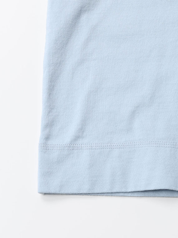 定番の40/2天竺にはコーマ糸を使用しています。糸はコーマ工程を通すことで、糸が滑らかで毛羽立ちの少ない糸になります。コーマ工程では、毛羽の素になる短い繊維を15%程取り除くので、糸はキレイで丈夫になるのです。そのコーマ糸を1本ではなく2本を撚って編むことで、更に毛羽立ちが少なく斜行しない生地になります。糸は左方向に撚りが掛けられているのが一般的です。一本の糸で編むと左に捩れようとしますが、2本を撚るときに反対の右方向に撚ることで、斜行せず安定した生地になります。定番なので、品質重視、毎年安定したクオリティでお届けしています。