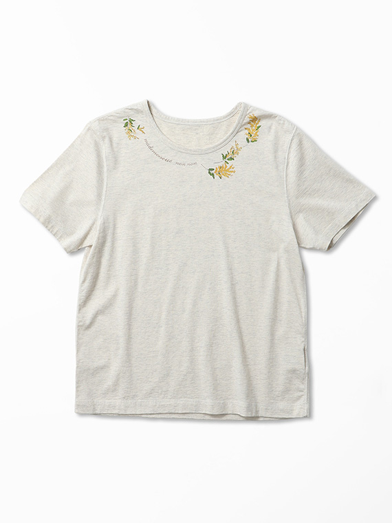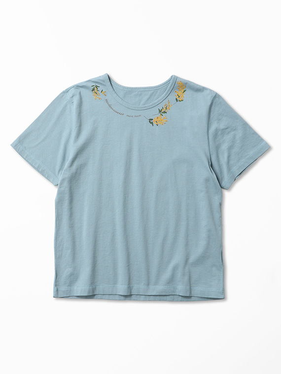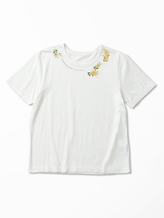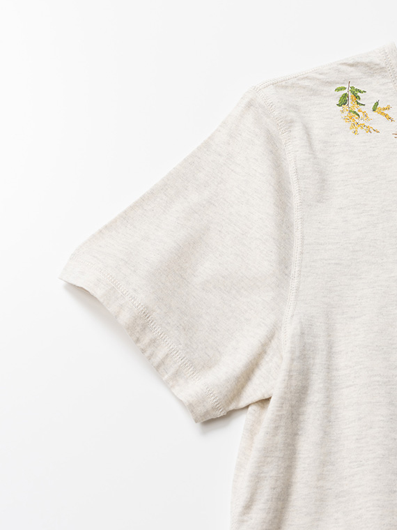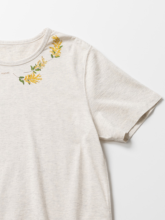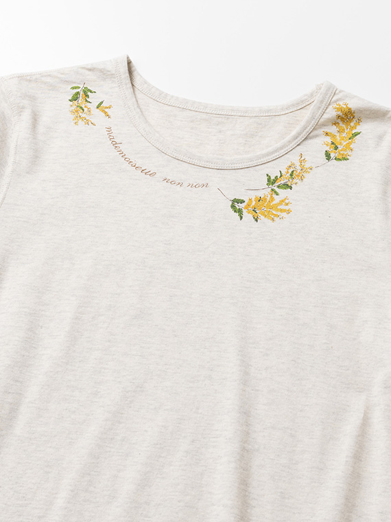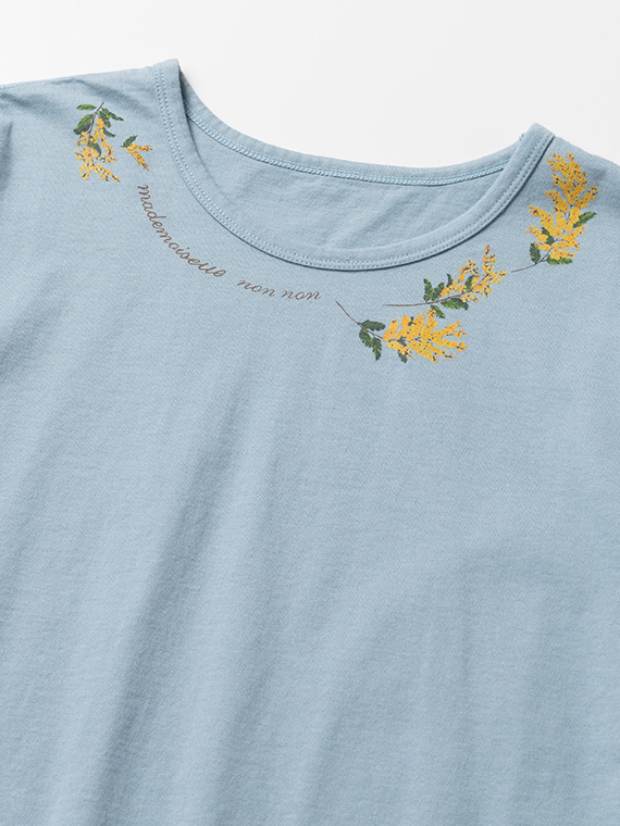 衿元にあしらった8色使いのミモザプリントが、可憐で華やかなアクセントに。顔まわりを明るく彩るデザインが印象的です。