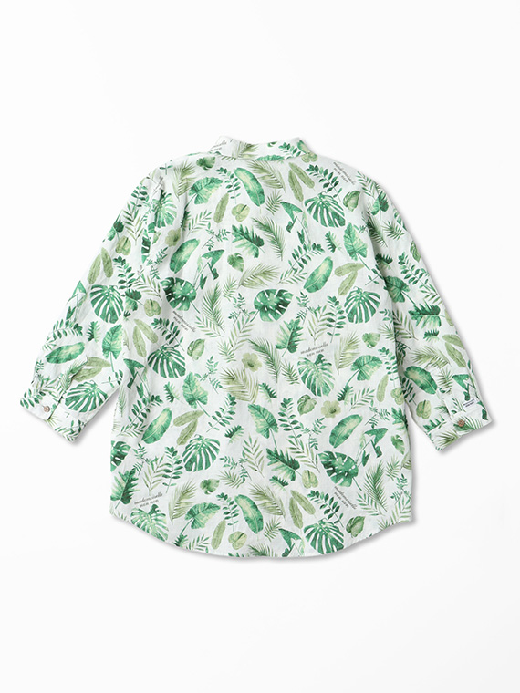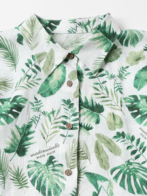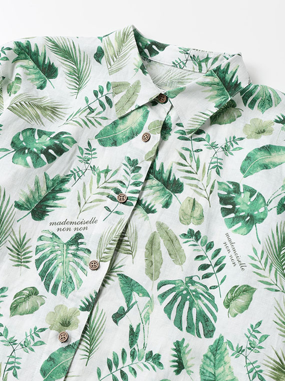 夏のトロピカルの色々な種類の葉を軽めの水彩画タッチで描きました。1方向でありながら美しく流れるような構図で総柄風にした迫力のあるプリント柄です。