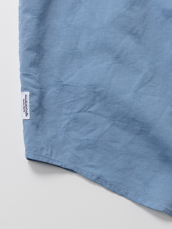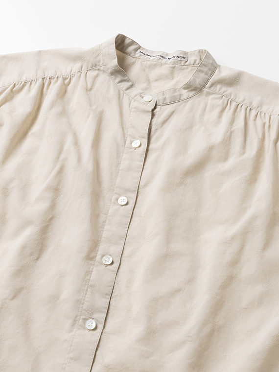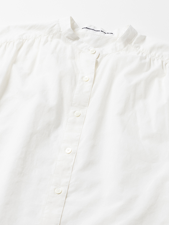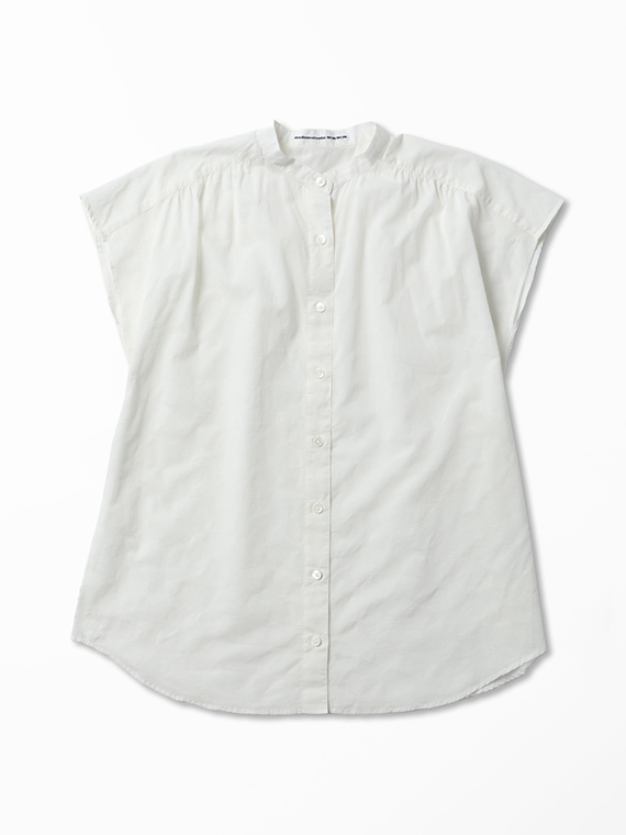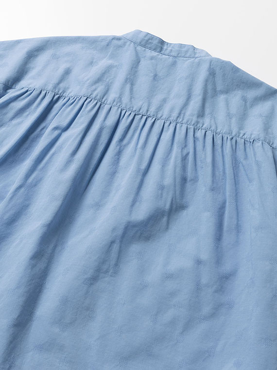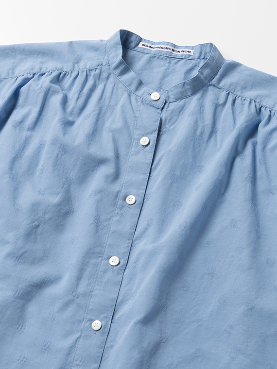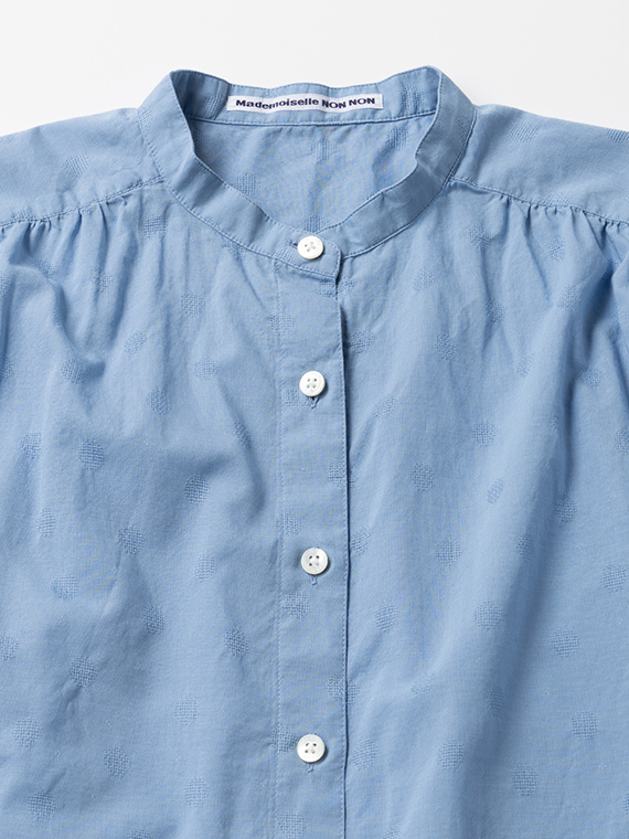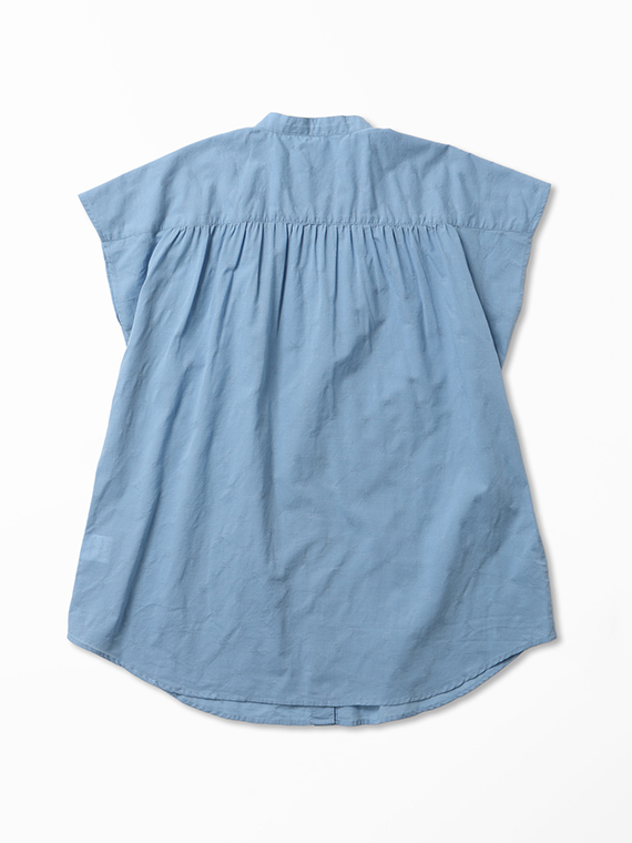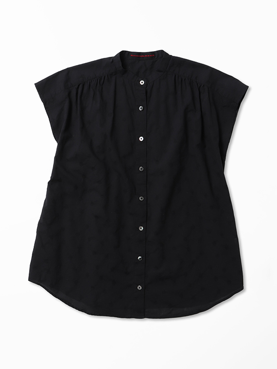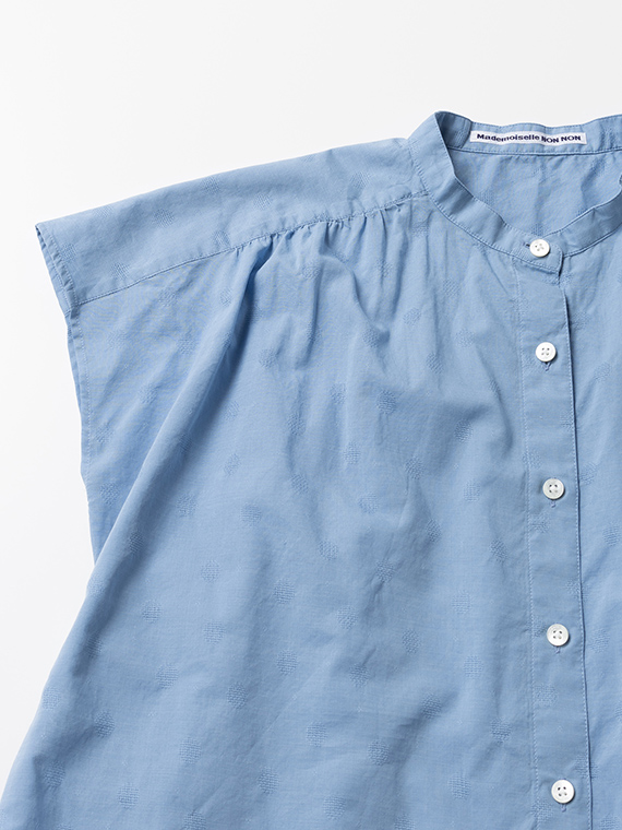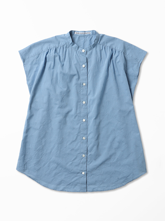 すっきりとしたバンドカラーに、軽やかなフレンチスリーブ仕様。涼しげで上品な印象を与える一枚です。