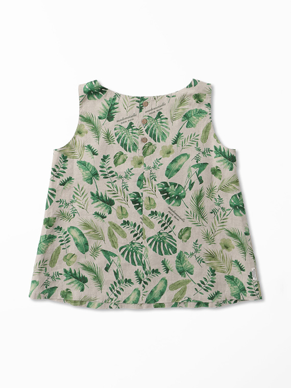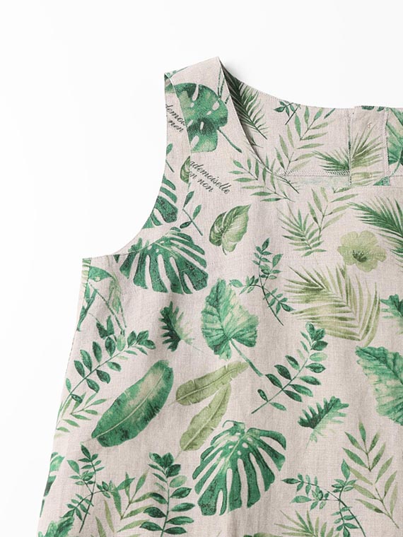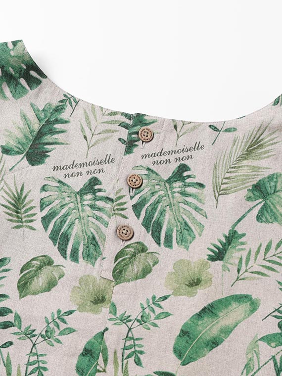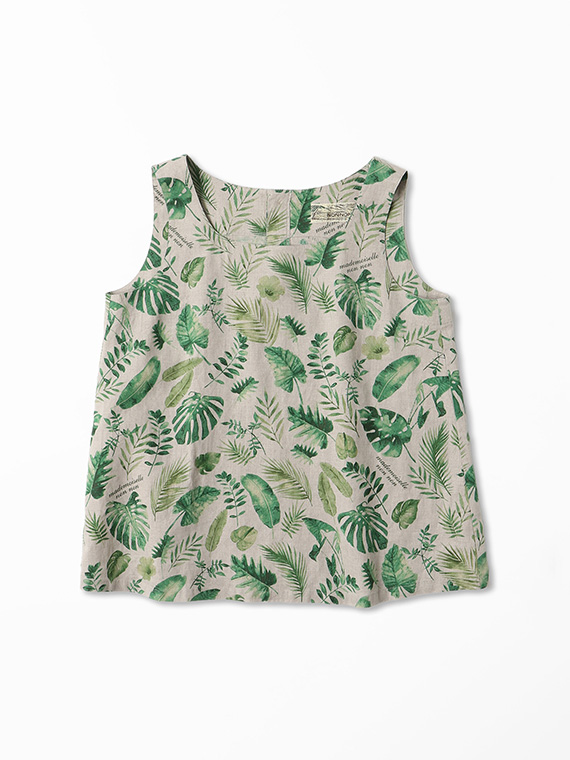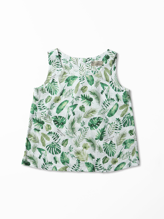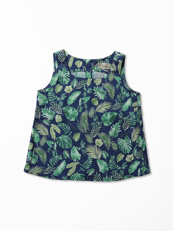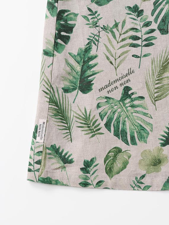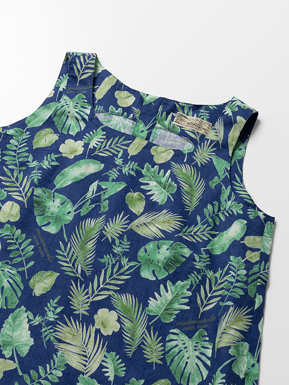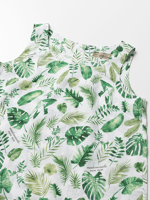 夏のトロピカルの色々な種類の葉を軽めの水彩画タッチで描きました。1方向でありながら美しく流れるような構図で総柄風にした迫力のあるプリント柄です。