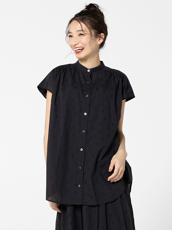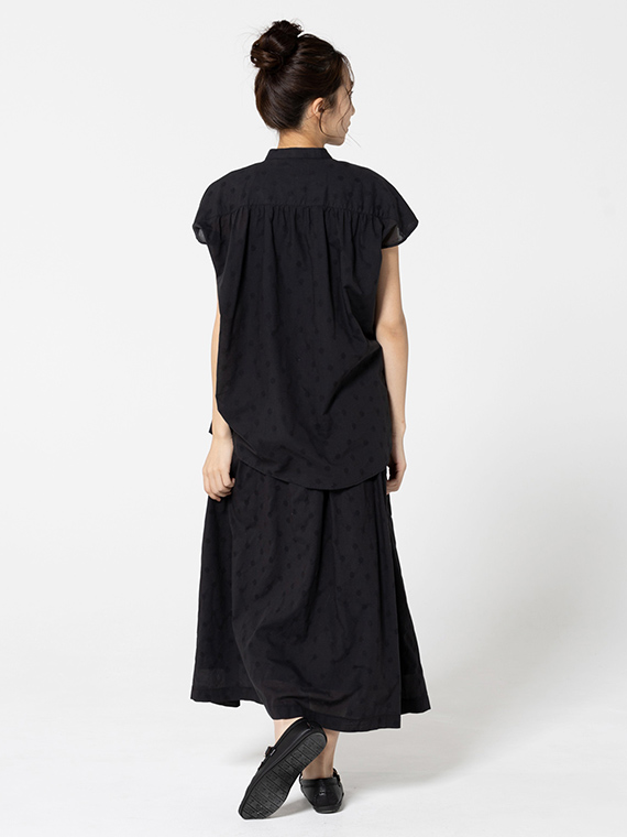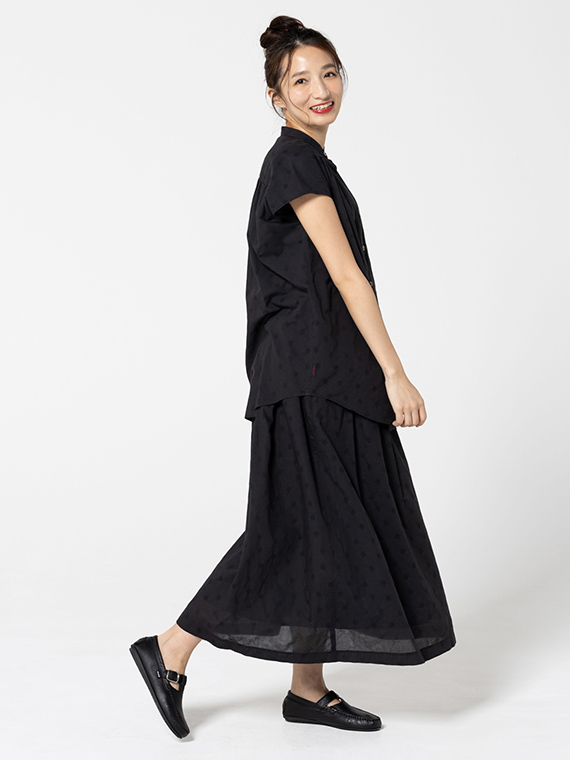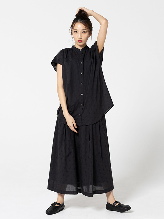 タテ糸に80/1、ヨコ糸に60/1ボイル強撚糸を使用した薄手の総柄ジャガードです。透明感ある繊細な無地グランドにパナマ調の組織で水玉をランダムに配置して、味付けに小さなドビー調の組織を全体に散りばめました。薄手ながらヨコ糸にボイル強撚糸を使用することで糸の膨らみ感が増しドレープ性もアップしています。また、ヨコ糸のボイル強撚糸はZ撚りとS撚りを交互で織ることで硬さを極力抑え、膨らみ感あるシルキーでソフトな風合いに仕上げました。