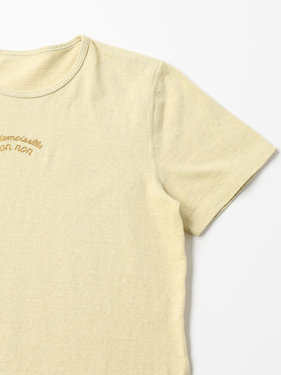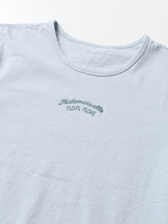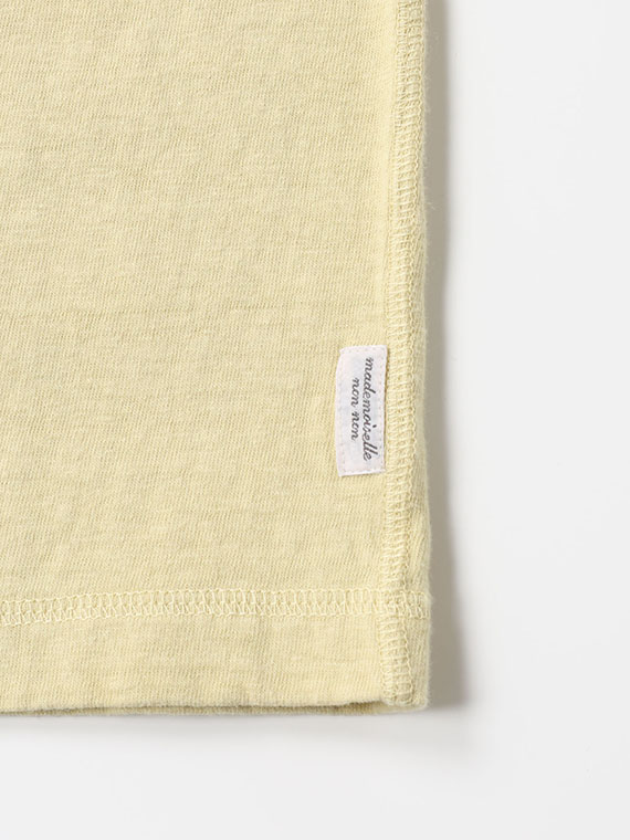ラフィは超長綿糸(スビン、トルファン、アルティメイトピマなど)を作る工程で落とされる繊維の短い未利用綿をブレンドして出来る糸で、糸にナチュラルなムラを入れたヴィンテージ感のあるエコな素材です。ラフィに上質な麻をブレンドしたのがこのモンサンミッシェル&ラフィです。このラフィをベースに良質な原料の産地で有名なコルトレイク産のベルギーリネンと、強力と光沢に優れるラミーの2種類をバランス良く配合しています。モンサンミッシェル&ラフィの糸だけで編むのではなく、同じ太さのコットン100%のラフィ糸と交互に編むことで、麻の固さを緩和し、綿の着心地の良さを際立たせ、より着用しやすい着心地になるよう心掛けて作製したオリジナルの天竺生地です。