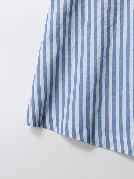 タテ糸に毛羽の少ない70/1のコンパクト糸を使用し、ヨコ糸には綿麻50/1と綿50/1強撚を1本切り替えで使用し、高密度に織り上げた素材です。仕上げに小さい釜で1反ずつ丁寧にワッシャーをかけてから乾燥させることで、程良いハリ感を残しつつ、柔らかいタッチに仕上げています。強撚糸を使用することでワッシャー後の生地に良く働き、夏らしい表面感と清涼感を感じる素材です。
