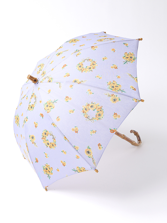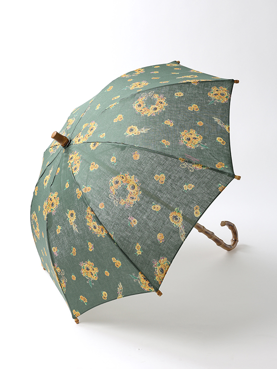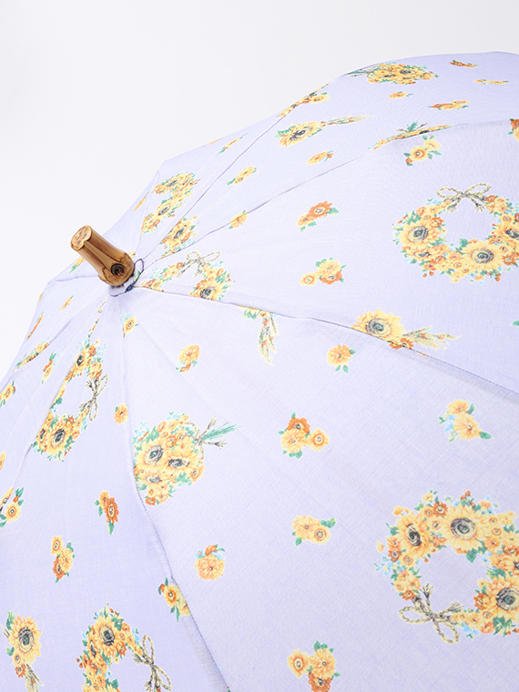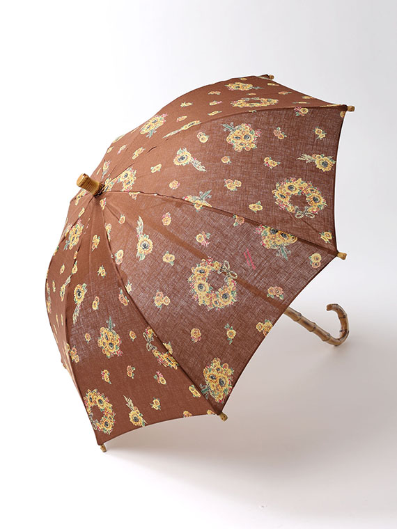 下生地は、リネンの原料の中で最高ランクであるベルギー近辺の大変貴重な原料を使用したリネン本来の清涼感、高級感のある素材です。夏の代名詞であるひまわりをメインに小花とも組み合わせてリースやブーケにして描きました。色展開ごとに印象が変わるように小花等の配色を変えた女性らしい華やかな夏のプリント柄です。