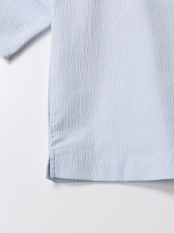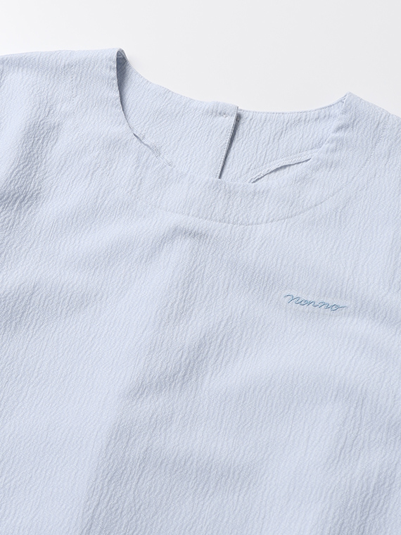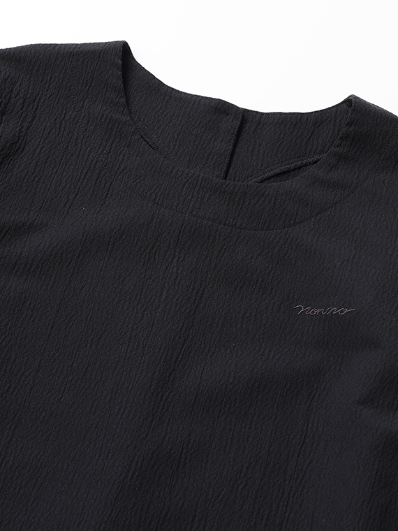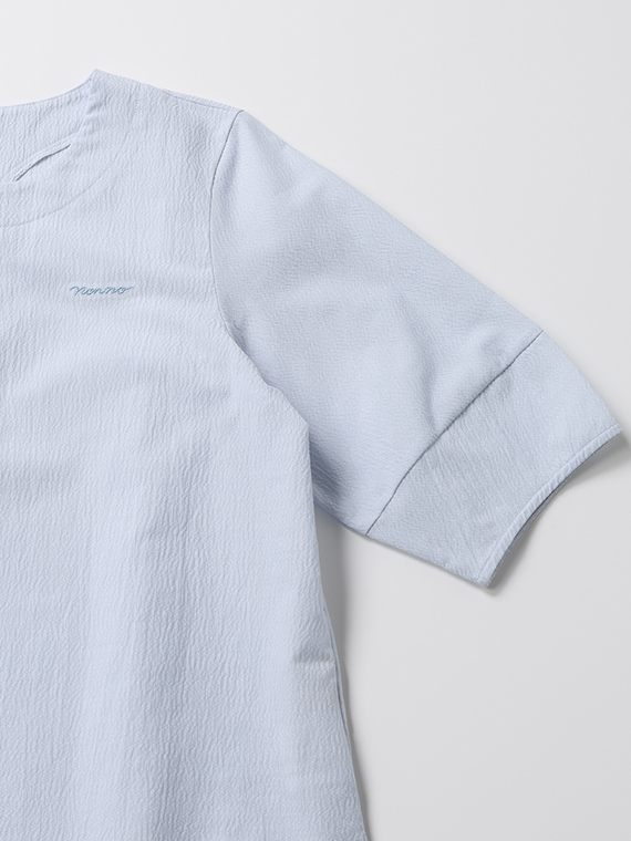 D036AU030の素材同様、織物のように整経した経糸に緯糸を絡ませ編んでいます。日本に数台しかないドイツのカールマイヤー社の経編み機で編み上げた希少性の高い素材です。ポリエステルとポリエステルの芯に綿をカバーリングさせて2種類の糸の収縮差を利用しナチュラルなしわ感を表現しています。ジャージ素材でありながら張り感があり布帛とカットソーの良さが出ている素材です。