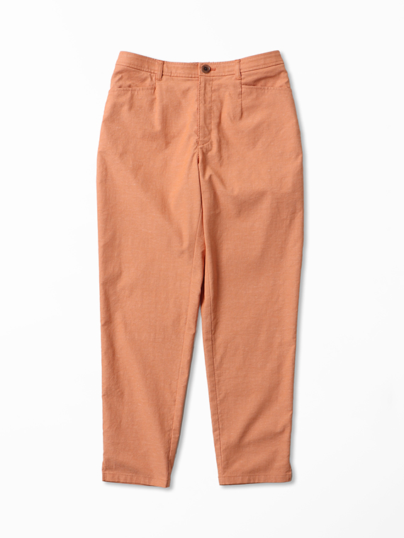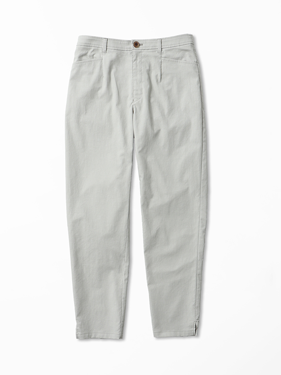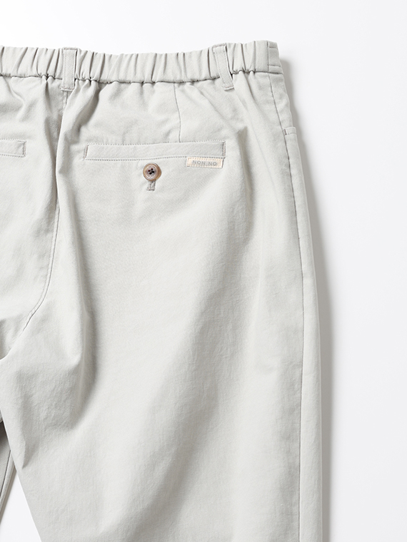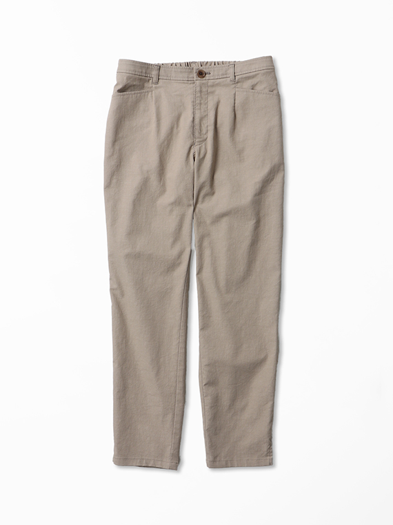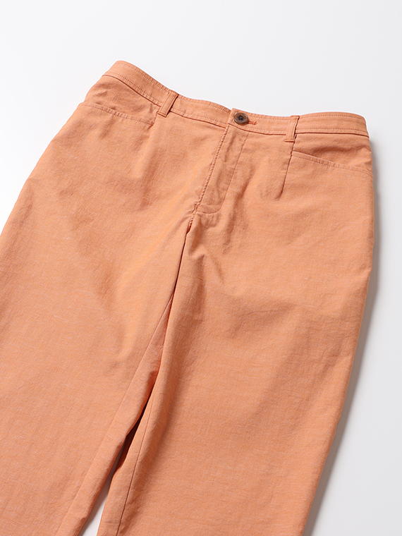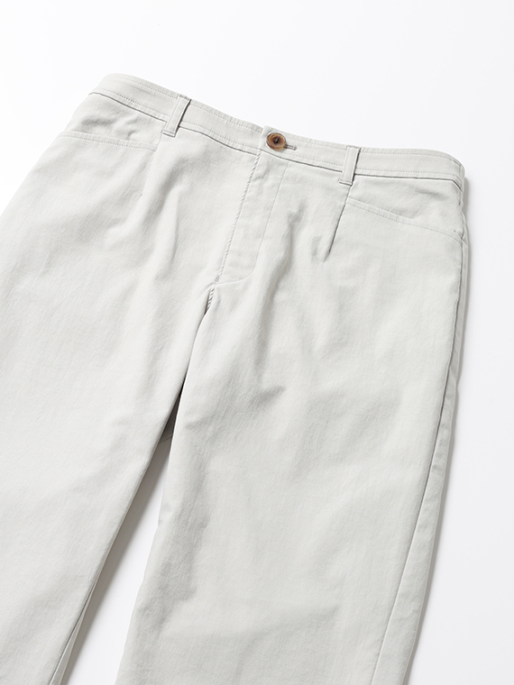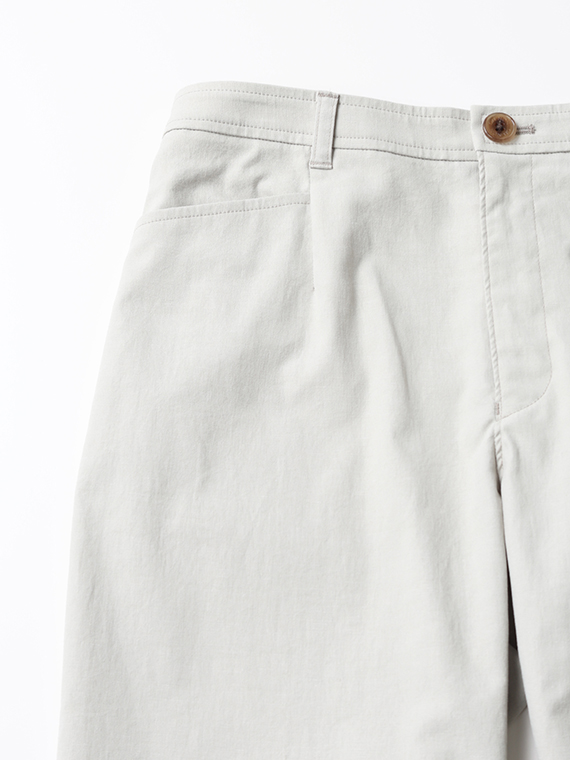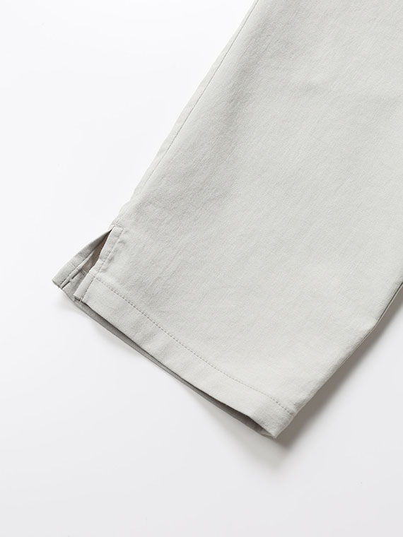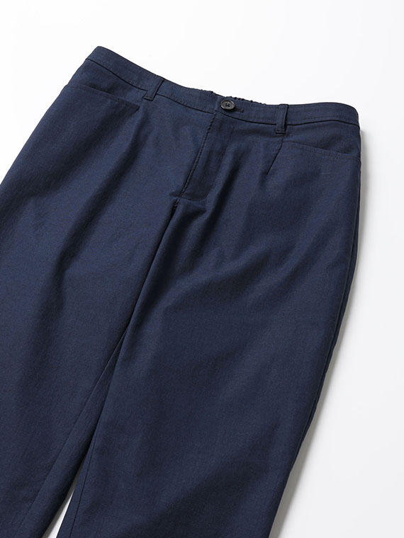 タテ糸にスパンフルダルポリエステル、ヨコ糸に40/1の綿麻混紡糸と84Tポリエステルストレッチ糸を配置した引き揃えオックス組織の素材です。まるでコットンに見えるタテ糸に綿麻混紡糸のヨコ糸を使用することで麻特有のスラブネップ効果でより天然素材ライクな表情になっています。優れたストレッチ性とドライタッチな風合いも併せ持った、清涼感のある肌離れも良い履き心地を実感できる素材と言えるでしょう。
