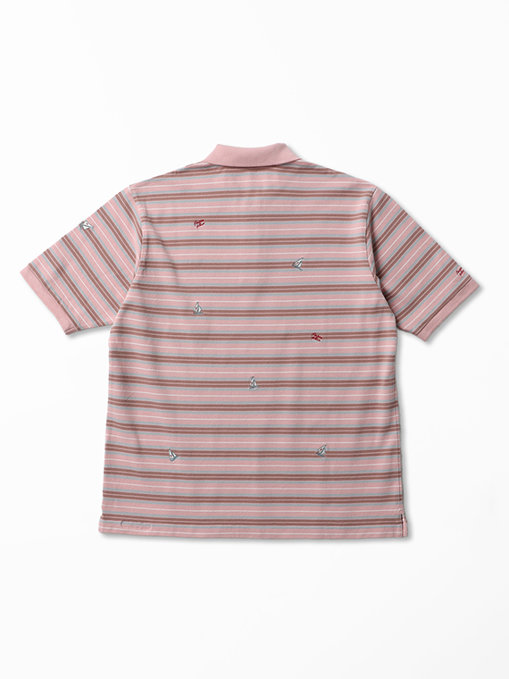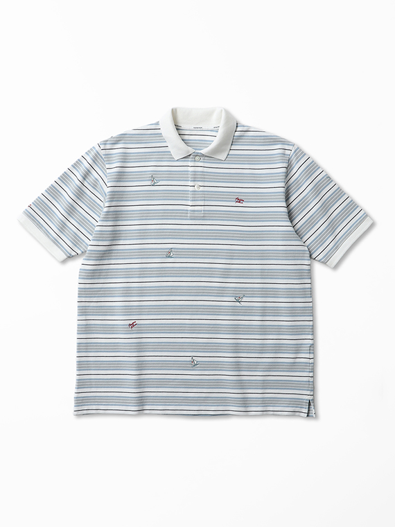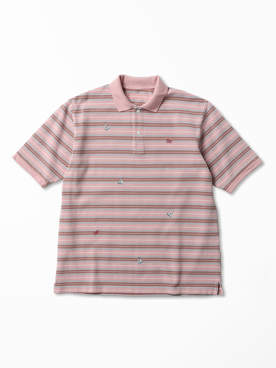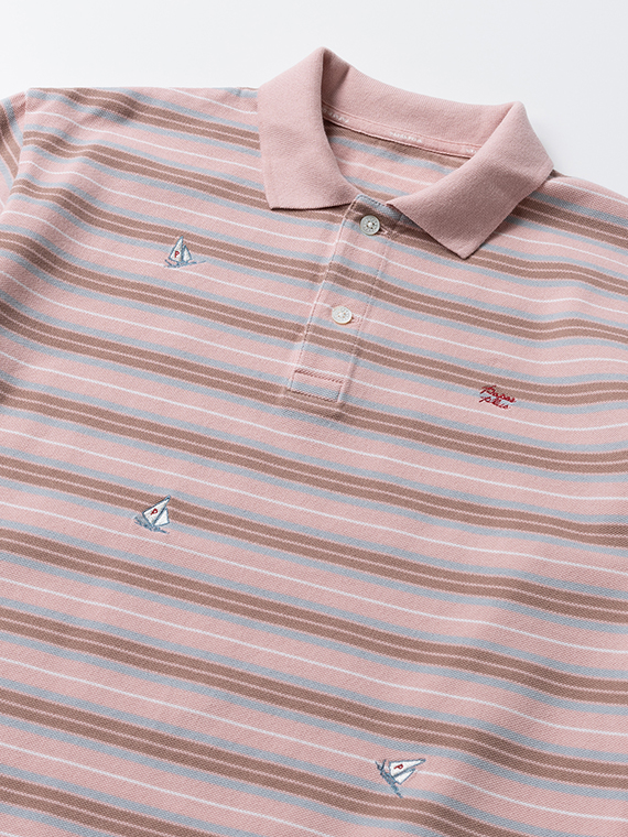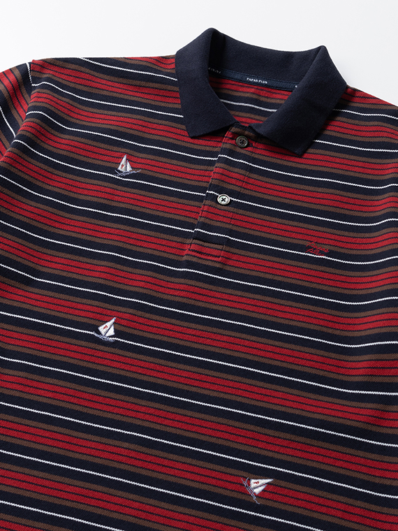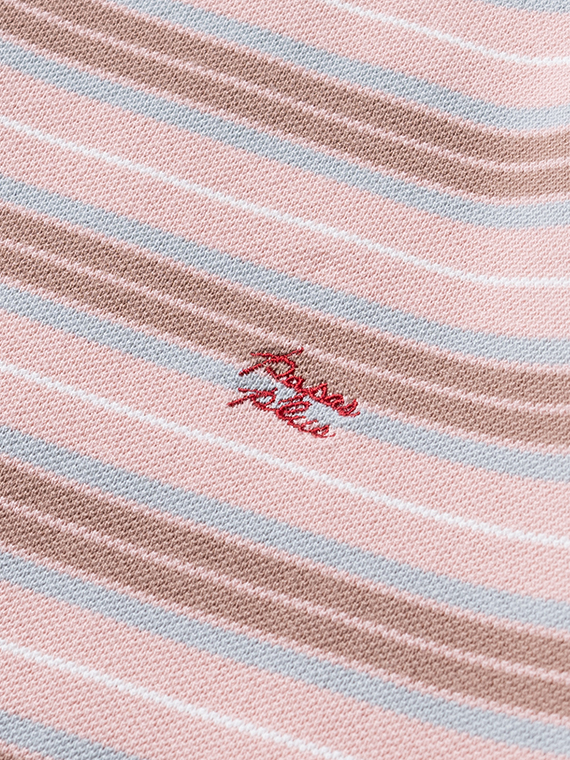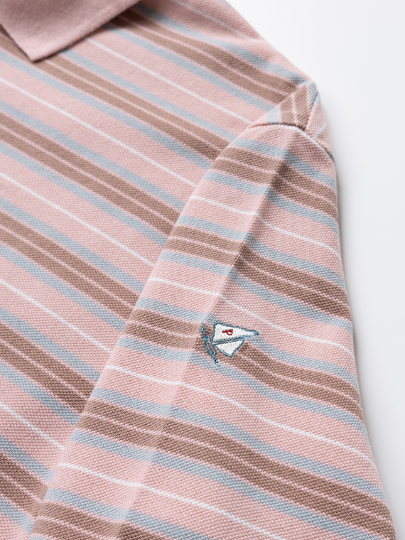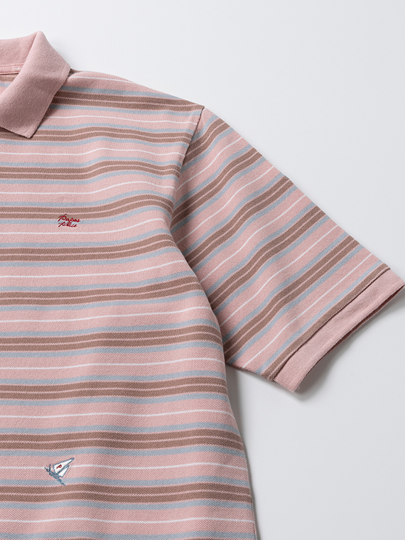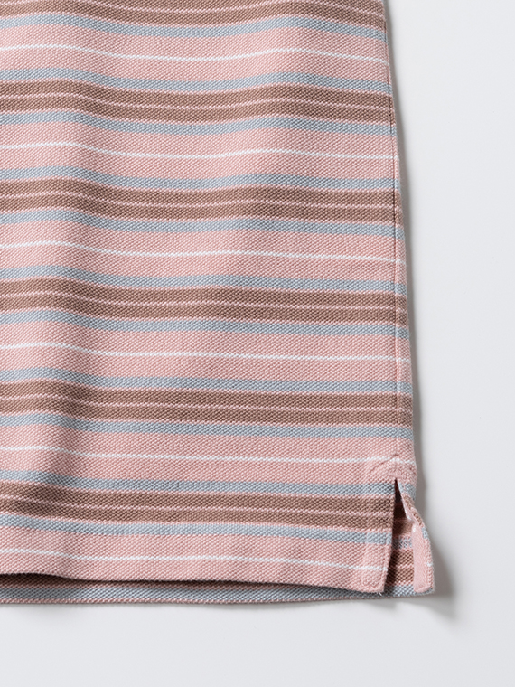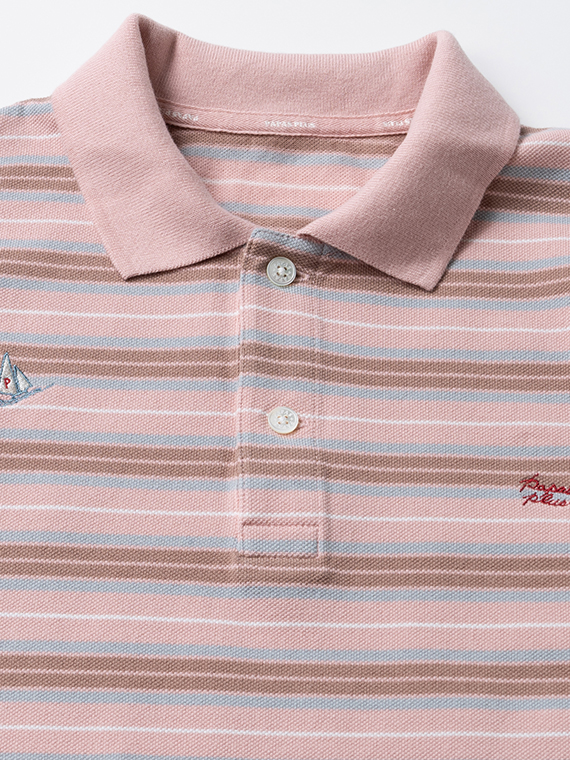 生地には、40/2の先染め糸を使用し、PAPASPLUSオリジナルのボーダー配色を特殊な編み機で丁寧に編み立てています。鹿の子組織ならではの清涼感と立体感のある表面感が特長です。仕上げ工程では通常とは異なる特殊な柔軟加工を施し、硬すぎず柔らかすぎない、程よい風合いに調整。快適な着心地と上質な質感を兼ね備えた一枚に仕上げています。